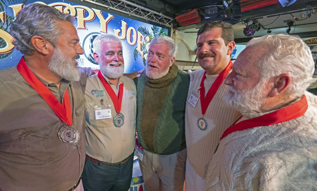 Contestants congratulate Gerrit Marshall, center, for winning the annual Hemingway Look-Alike Contest at Sloppy Joe’s Bar in Key West, Fla.