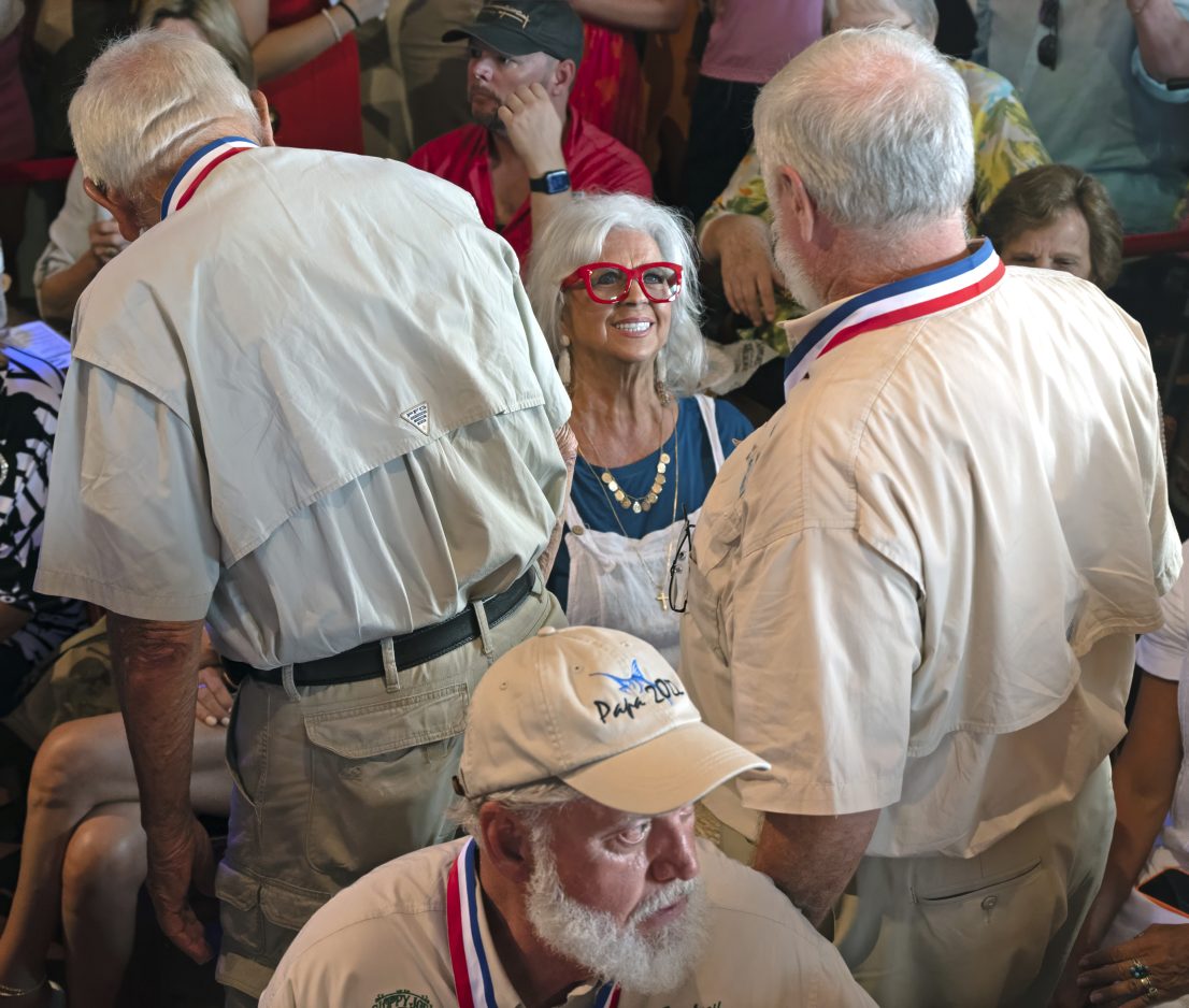 In this Saturday, July 22, 2023, photo provided by the Florida Keys News Bureau, celebrity chef Paula Deen, center, greets previous winners of the Hemingway Look-Alike Contest at Sloppy Joe's Bar in Key West, Fla. Deen's husband, Michael Groover, won the contest in 2018. At front is 2022 winner Jon Auvil. The competition was a highlight of the annual Hemingway Days festival that ends Sunday, July 23. Ernest Hemingway lived in Key West throughout most of the 1930s.