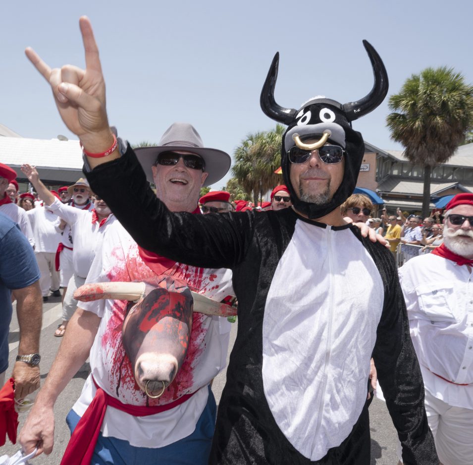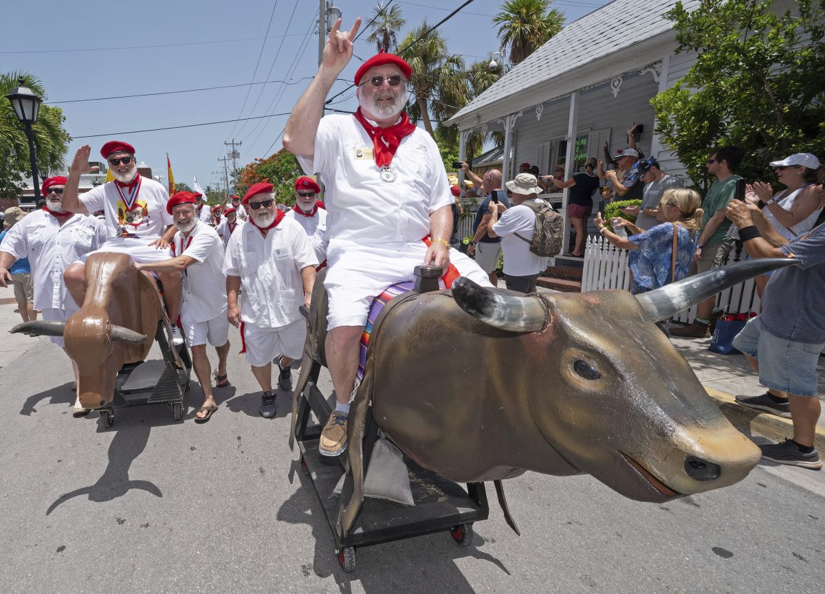In this photo provided by the Florida Keys News Bureau, Hemingway Days festival attendees have fun with costuming as they join Ernest Hemingway look-alikes during the annual "Running of the Bulls" Saturday, July 22, 2023, in Key West, Fla. The lighthearted take-off on the famed run in Pamplona, Spain, features replica bulls on wheels and is a focal element of the island city's annual Hemingway Days festival that ends Sunday, July 23. The Nobel Prize–winning author lived and wrote in Key West throughout most of the 1930s.