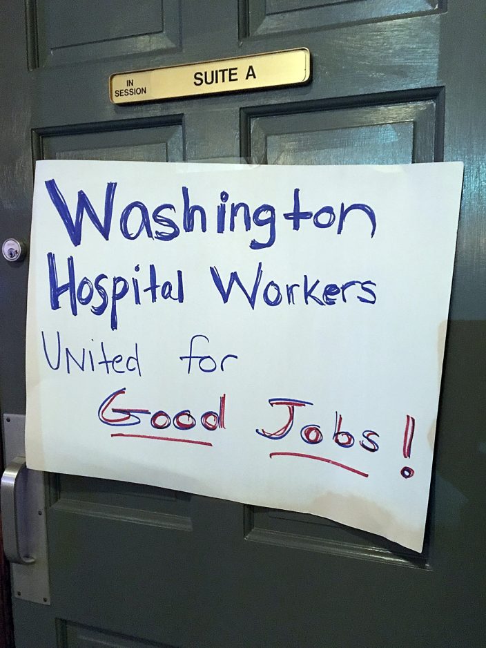 Throughout Tuesday, hospital workers represented by SEIU attended meetings at the Ramada Inn to hear details of the most recent contract negotiations and decide their next move.