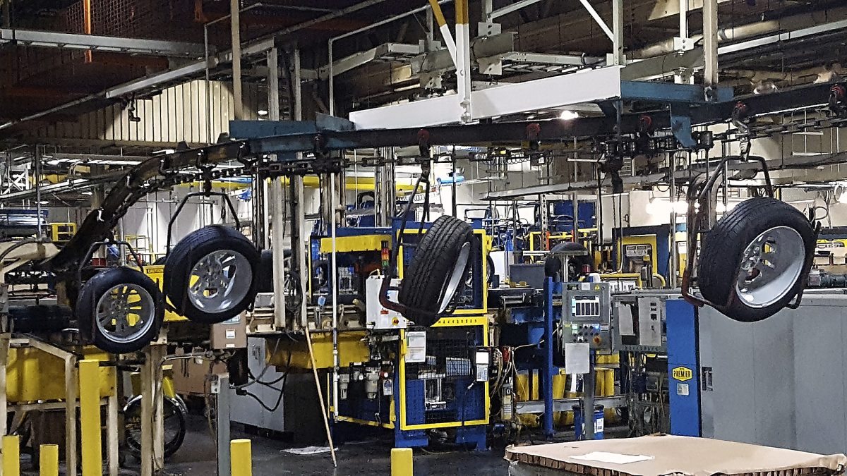 Cars are attached to rails like a roller coaster and can be seen moving high above the floor as they move to different sections of the trim shop. There are strict standards, rules and safety regulations that are normal operating procedure to keep workers from being injured, Northeast Region Chevy Field Manager Stacey Hardway said.