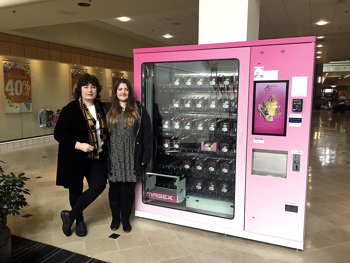 A young girl whose mom declined to identify – she was supposed to be in school, her mom confessed a tad sheepishly – studied the inventory of gourmet offerings that included lemon chiffon, salted caramel almond, red velvet and double chocolate before settling on vanilla. Her eyes grew wide as she fed the dollar bills into the machine and watched the motorized tray spring to life. It moved up, up, up past row after row of little pink boxes, stopping at the vanilla selection and oh-so-gently retrieving one, then carefully lowering its payload to the dispenser below.