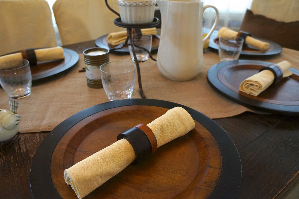 The wooden chargers, wooden napkin rings and chair covers and table linens all are from Pottery Barn, one of my favorite stores. The metal leaf stand and ramekins are from Willow House. With stands like these, you can put candles on it to give it a different look. Photo courtesy of