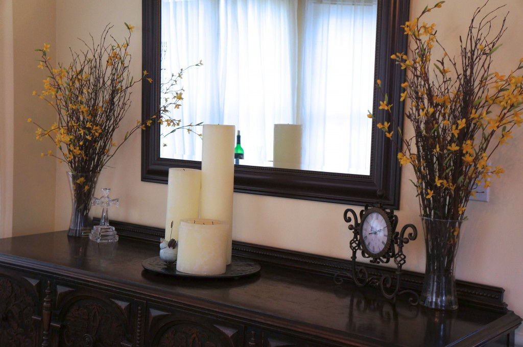 These three ivory pillar candles and tray are from Pottery Barn, adding a clean feel to the buffet. The two dried floral arrangements are from TJMaxx and this is the place and time of year to keep your eyes open for arrangements like this! The prices are incredible and the arrangements last for years. Photo courtesy of