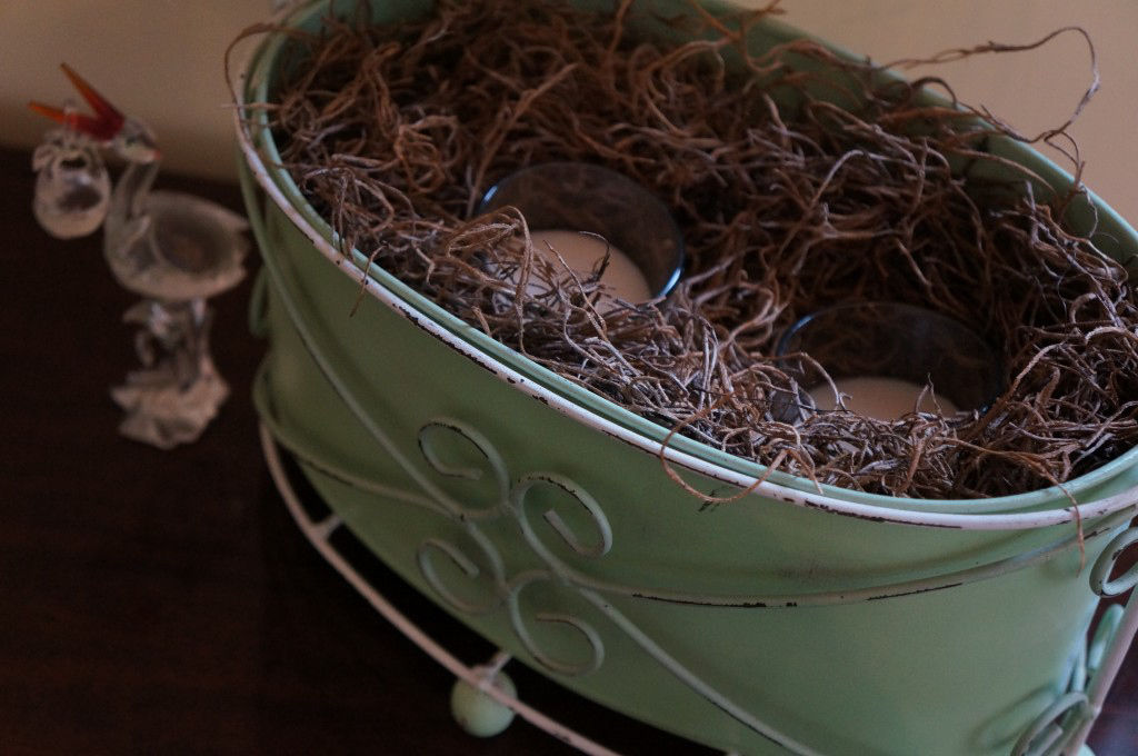 I found this little metal holder in our storage room, filled it with raffia grass and added a few tea light candles inside (which I don’t plan to burn). Photo courtesy of
