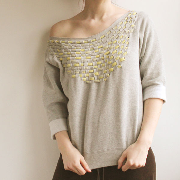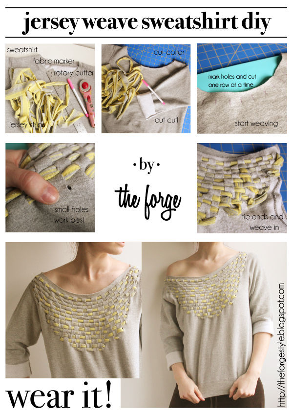On the sweatshirt, I cut off the collar and the cuffs and then I marked my first row of holes with a fabric marker (this washes out). When you’re ready to cut, make sure to cut tiny holes and keep them about a 1/2 inch apart. Next, just started weaving the fabric strips through the holes. When you come to the end of each row, remember to reverse the up and down weaving motion going the other way so that you’re alternating the gray from the sweater and your fabric.