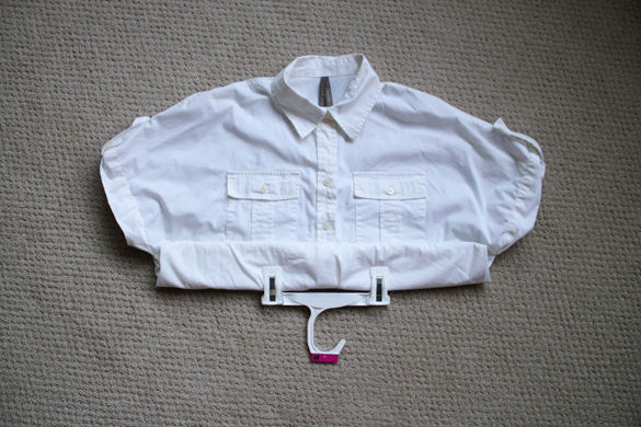 Because I wanted the darkest part of the gradient to be at the shirt collar, I rolled up the bottom half of the shirt evenly and put a hanger right in the center. This will make it much easier to dip the garment and less likely for you to accidentally get dye splashes where you don’t want it. If possible, it really helps to have something to hang the garment from when trying to achieve a darker color otherwise be prepared to hold the item for a while.