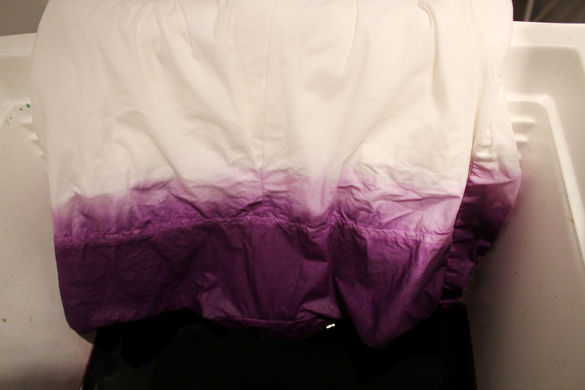 • Mix the dye with the hot water and salt according to the directions on the bottle. I used half a bottle since I was only dyeing two items. Also, make sure to wear gloves and clean up any splashes on the tub so they don’t come into contact with the lighter parts of your garment.