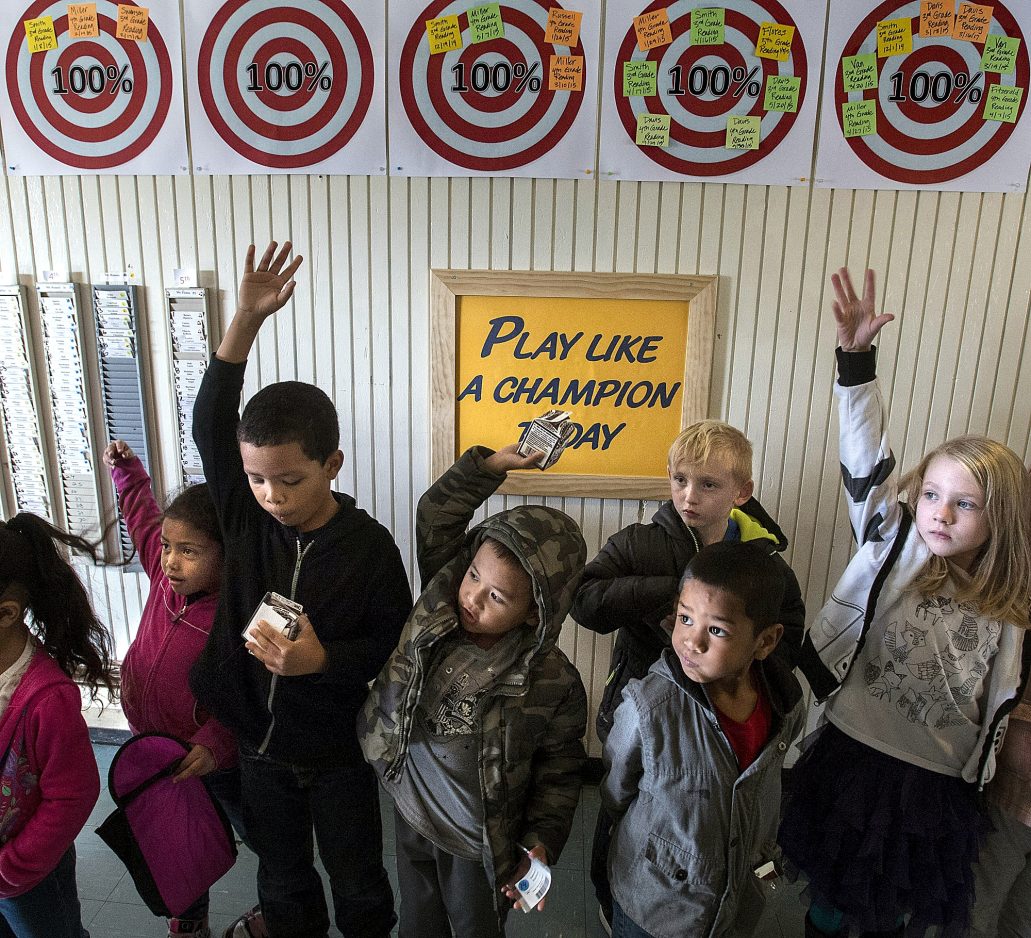 Students get 90 minutes of reading and 90 minutes of math each day, plus 30 minutes of writing instruction. That happens in the morning or early afternoon. The rest of the day is devoted to science, social studies and pull-out intervention for students who are below standards.