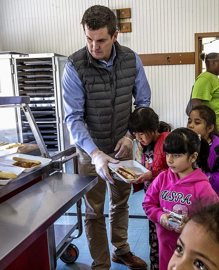 Inside the cafeteria, Jensen makes his rounds as kids eat breakfast. Because of the school’s high poverty rate, all students receive breakfast and lunch at school.