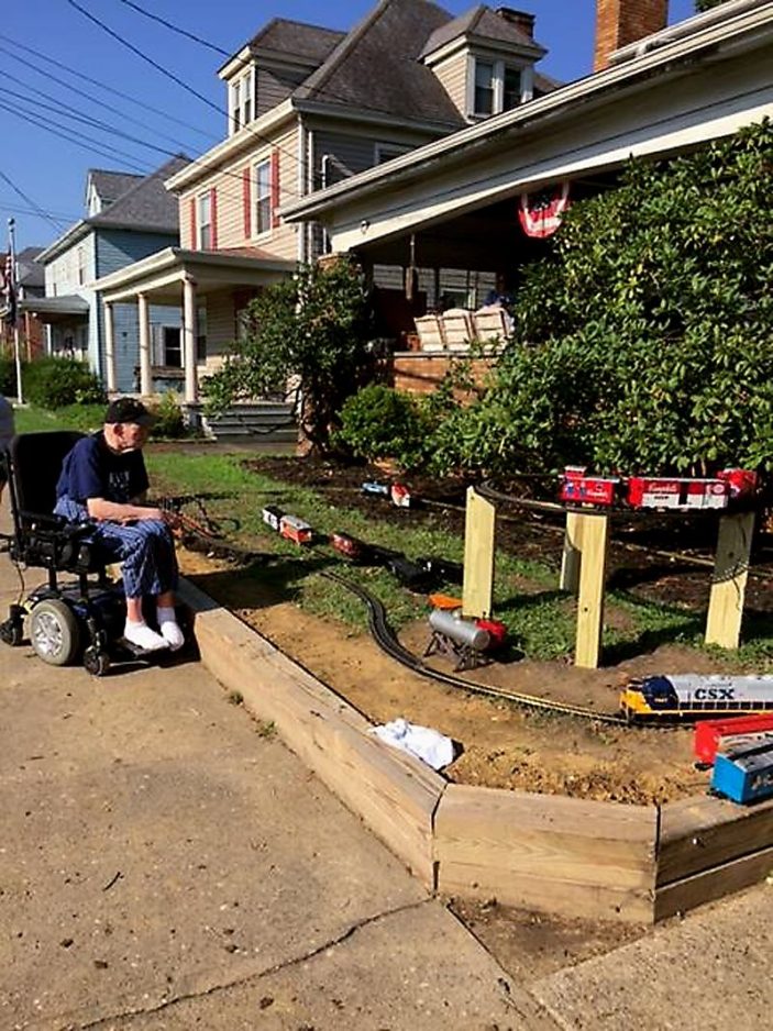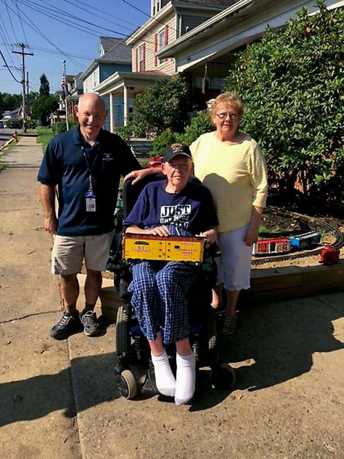 Charles Fife of Houston, a Vietnam Navy veteran, had mentioned to his hospice social worker that his dream was to build a G-scale railroad in his front yard. Fife’s wife of 50 years, Virginia, was on board, too. So, the Washington Gateway Hospice team formulated a plan to fulfill his wish. Dr. Mark Mamros, a Gateway Hospice medical director and train enthusiast who co-founded the Pittsburgh Garden Railway Society in 1994 and served as first vice president, enlisted the help of Kashmir Moncheck, an Eagle Scout from Troop 1313, who is working on his railroading badge. The two assembled the large track last week, and Fife couldn’t stop admiring it. There are two trains, one of which has a Heinz box car that Fife said was the start of his own G-scale collection. Many joined in the festivities, including the Visiting Angel team that helps provide care for Chuck. Also pictured are Mamros and Virginia Fife.