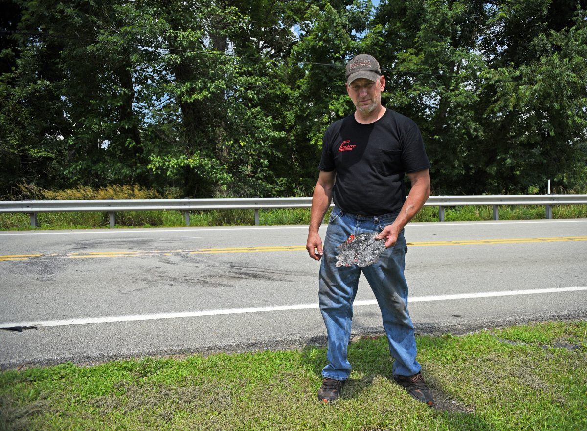 Burn marks that remain at the crash site attest to the seriousness of the crash. Rumble said he still finds pieces of the destroyed car when he mows a grassy strip off Route 88. He picked up three scraps of debris during the interview for this story.
