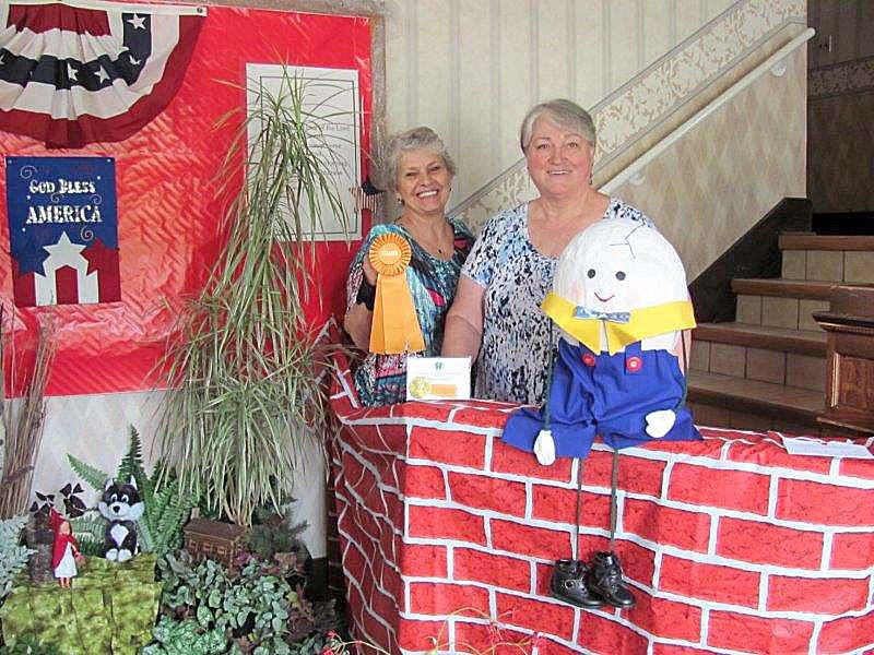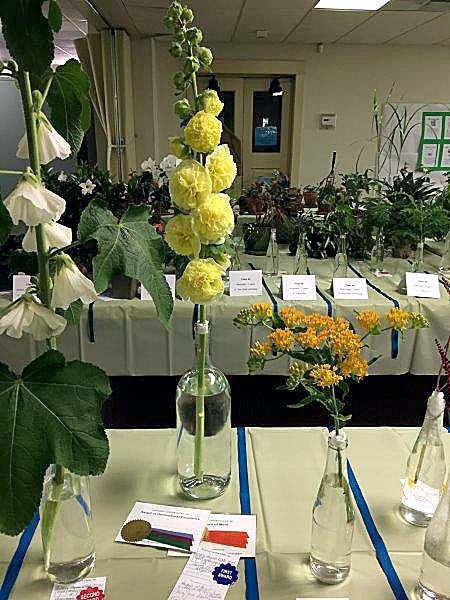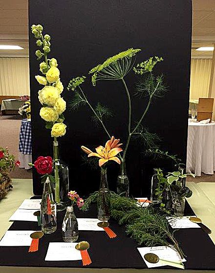 Town & Country Garden Cub recently held its flower show at Greene Valley Presbyterian Church in Carmichaels. Kas Maddich and Linda Shefcheck, above, display the Garden Club Federation of Pennsylvania staging award. Terri Laird, garden club president, won the award of horticulturcal excellence and an award of merit for her hollyhock, below left. Awards of merit were presented to Shefcheck for her climbing rose; Marion Walker, lily; Tami Burnworth, latana; and Susan Swala, dill. Swala also received the Arboreal Award for her curly leaf Eastern white pine.