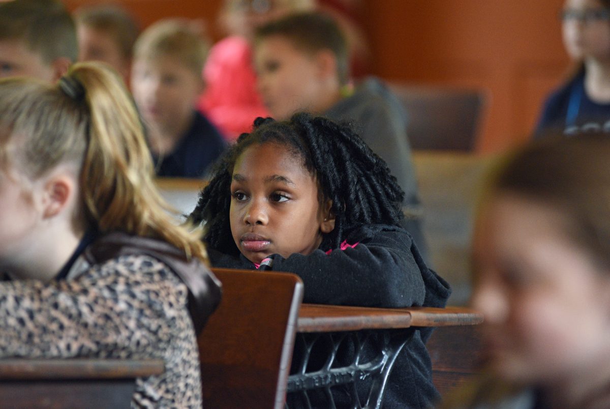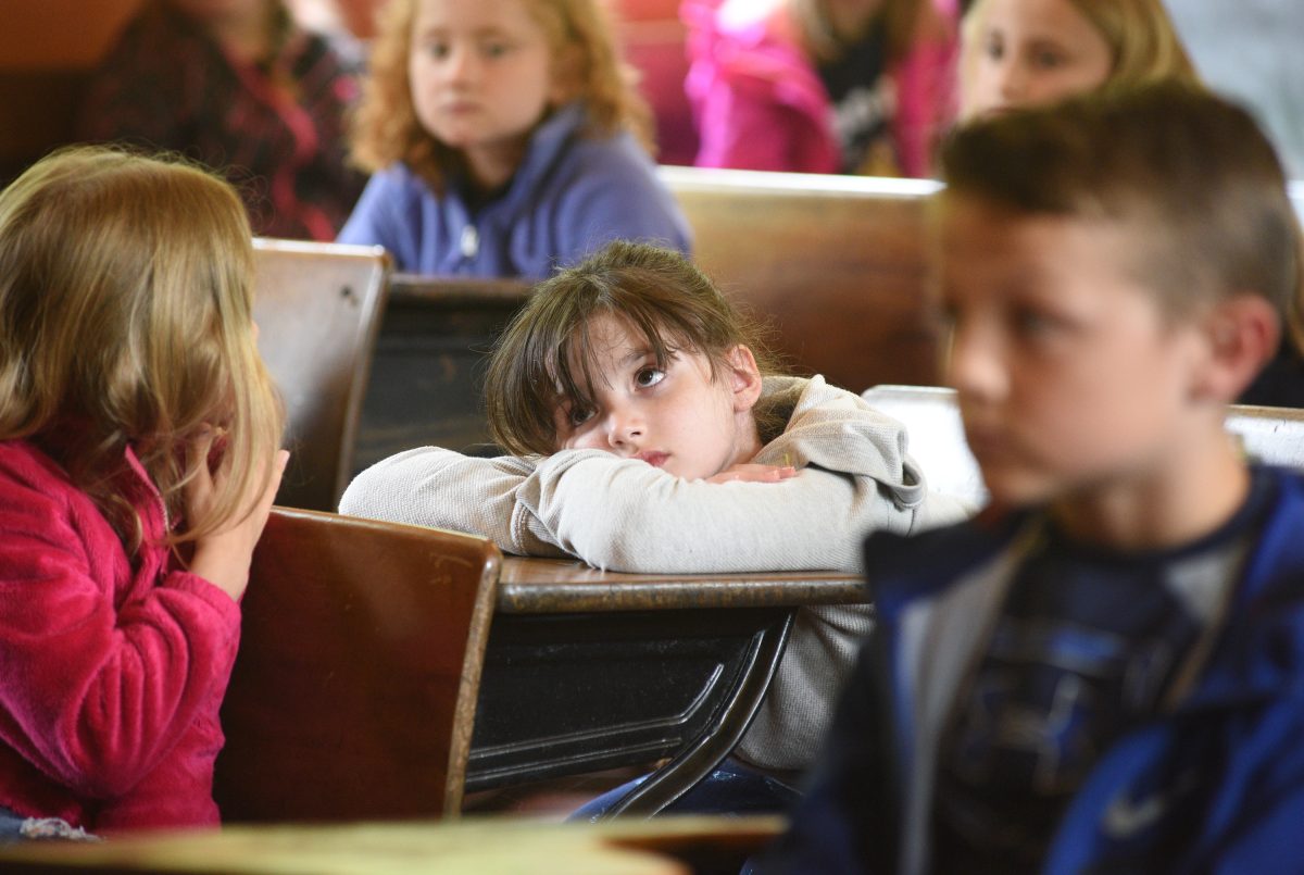 “Jordan School is different from what you are accustomed,” she said, addressing an audience that was small in stature and large in number. The 38 McGuffey second-graders who shoehorned into the refurbished one-room classroom Thursday morning comprised the first of a half-dozen groups of classmates to visit during the district’s annual field trip there.