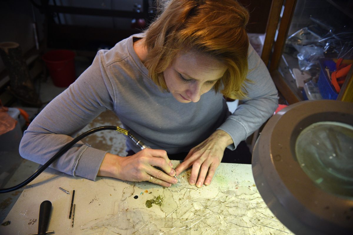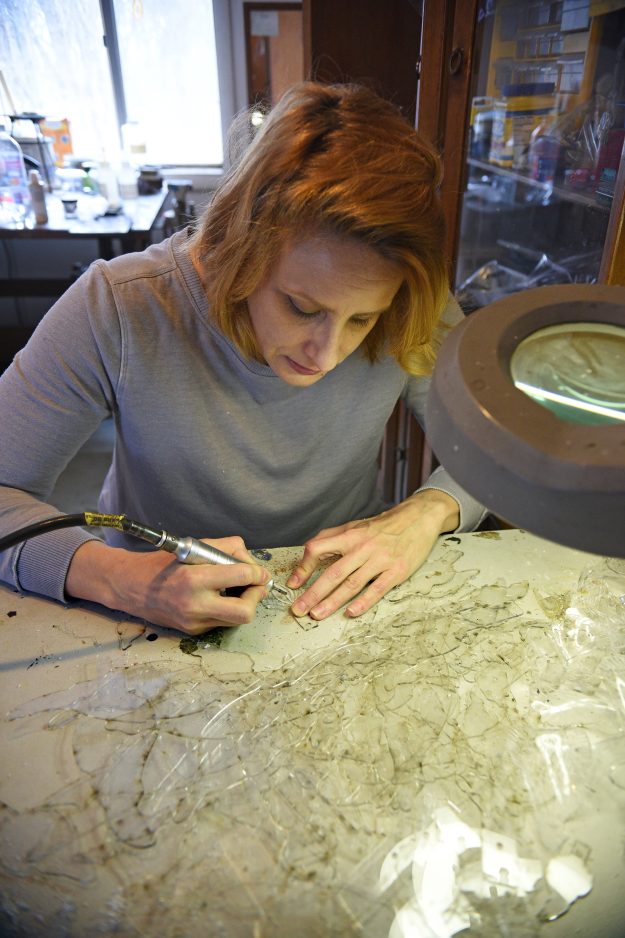 Even though the Plexiglas panels are now cut, Sabol still plans to etch them by hand. She’ll then heat-form them to make them soft and flexible before attaching them to the dress she’s titling “Crick,” an allusion to the way many area residents pronounce the word creek.