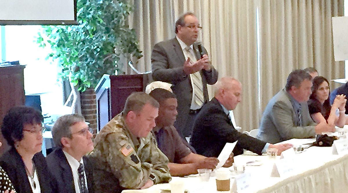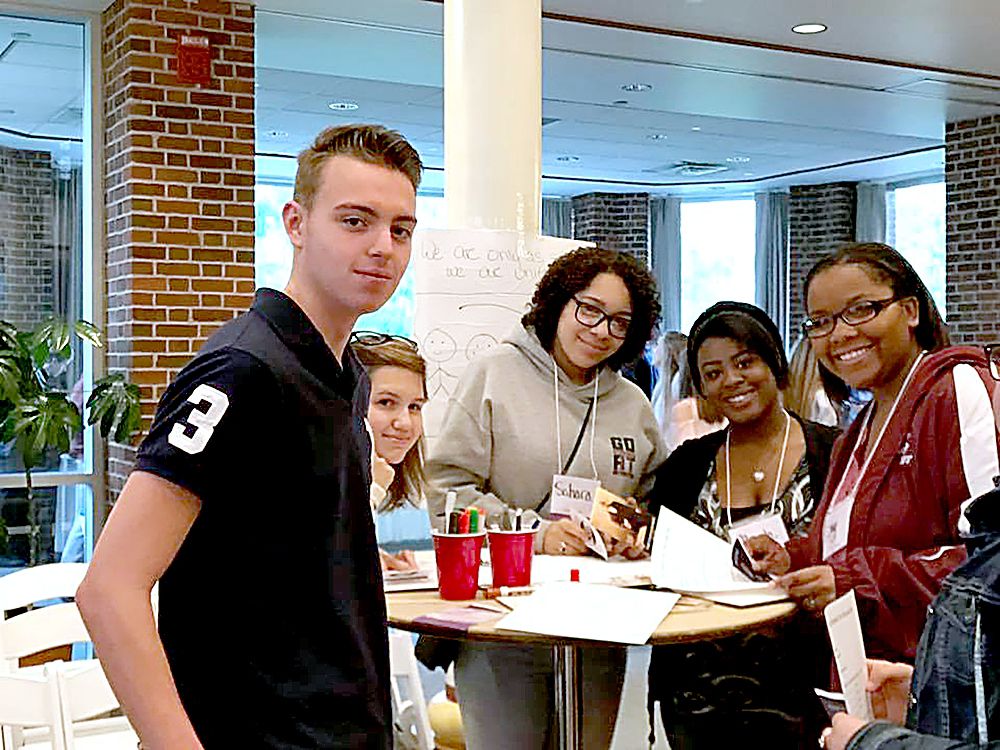 Representatives from all 14 school districts and an alternative school in Washington County participated in Washington Health System Teen Outreach’s 10th annual Ambassador for Respect program last week at Washington & Jefferson College. Each school district created its own “country,” complete with flag, motto, quote, song, government, officials, resources, budgets, Bill of Rights or constitutions, tax structures and policies. A panel of community leaders responded to each country’s press secretaries. Pictured above are members of Chartiers-Houston’s team, who created the country “Chartown.” Below are members of the panel.