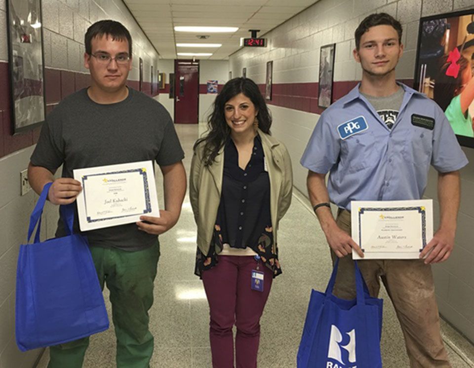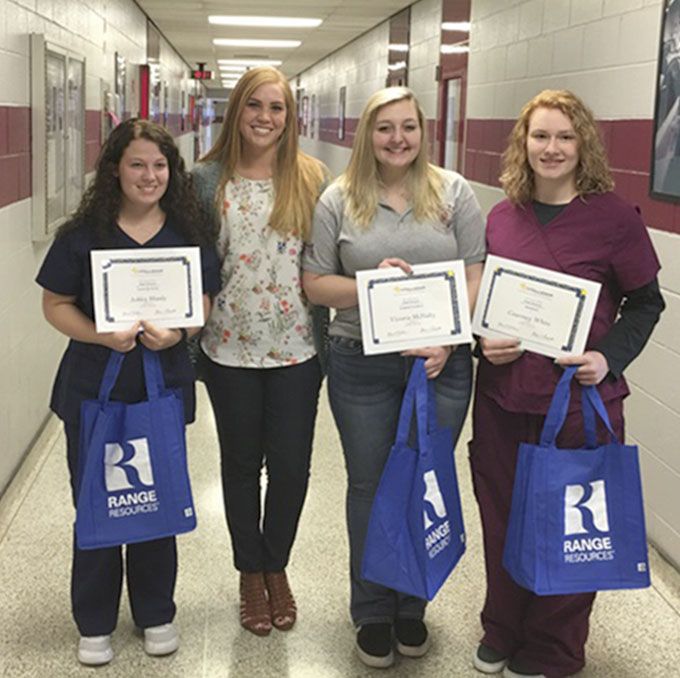 The Challenge Program Inc. recently distributed financial incentive awards to seniors at Western Area Career and Technology Center for excelling in attendance, STEM, community service, academic improvement and academic excellence. Range Resources is the sponsor at Western Area CTC. Winners in the morning session are, above, from left, Ashley Moody for community service; Kylie Sanders with Range Resources; Victoria McNulty for academic excellence; and Courtney White for attendance. Winners in the afternoon session are, below, from left, Joel Kubacki for STEM; Christina Colalillo with Range Resources; and Austin Walters for academic improvement.