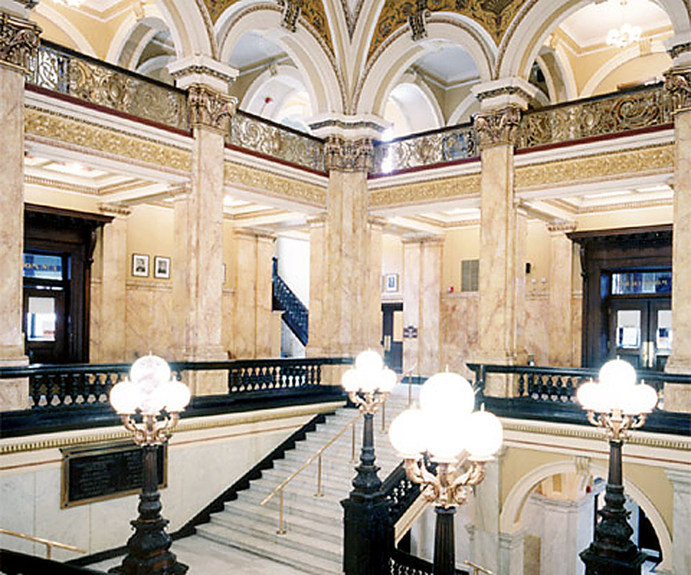 Built in 1900, the courthouse, at 1 S. Main St., Washington, was exalted as a masterpiece of Italian Renaissance-style architecture with its unique dome, marble-lined floors and walls, and immense exterior columns supporting the portico. A local decorator and florist will add fabric, lighting and greenery to the ornate space.