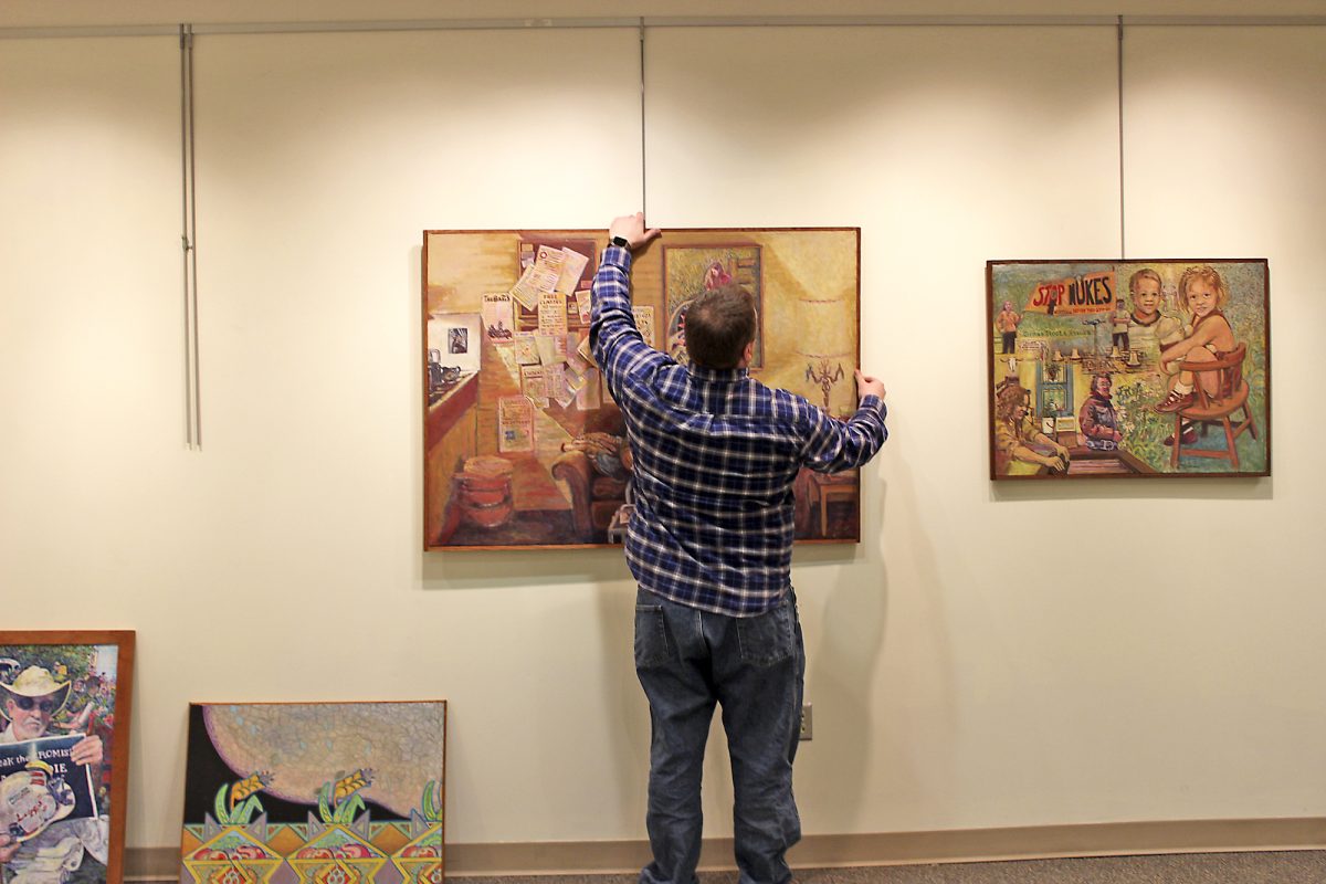 Andrew Heisey, director of the art program at Waynesburg University, prepares the gallery space for Colleen Nelson’s exhibit, “Retro-Spective.”