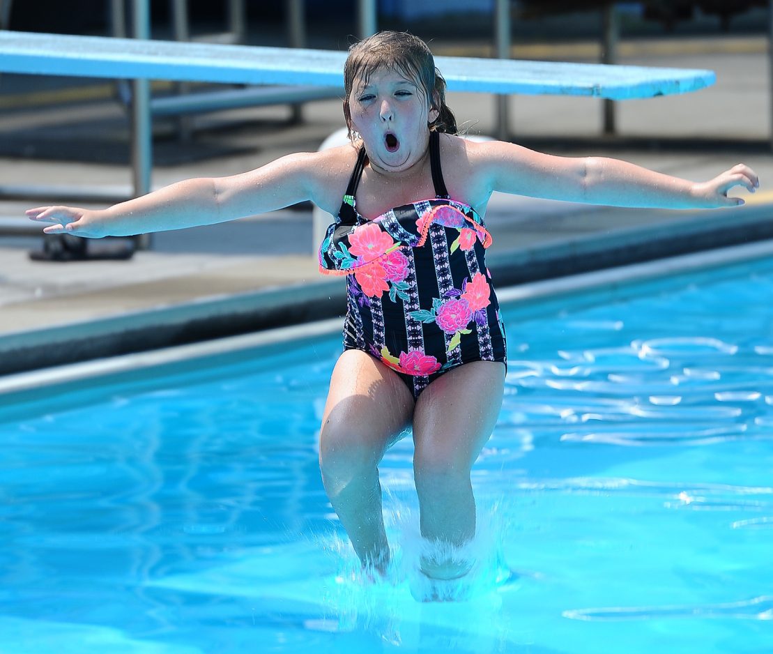 Alyssa, 7, was delighted to have been the first to leap off the diving board and enter Town Park pool in Canonsburg.