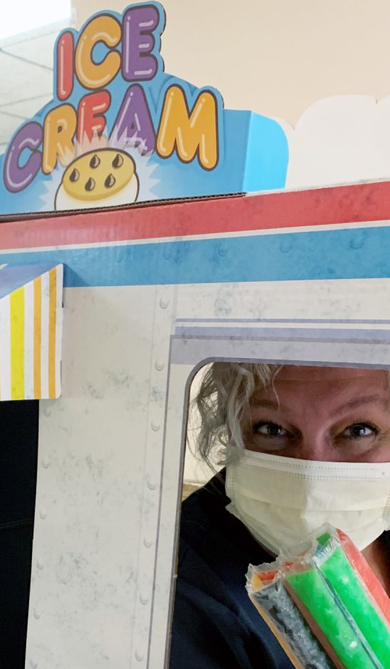 Recently, she assembled a cardboard ice cream truck and delivered ice pops to the residents.