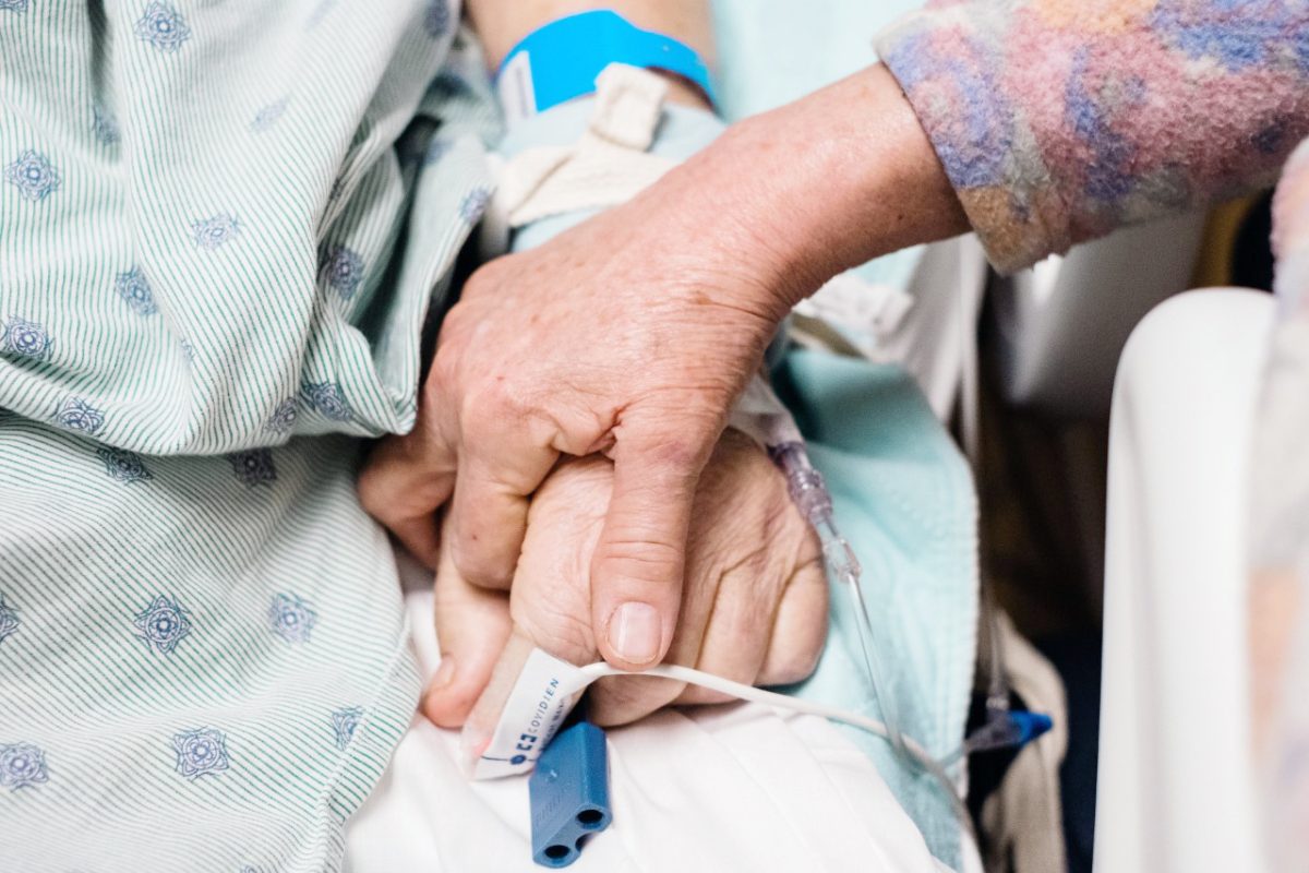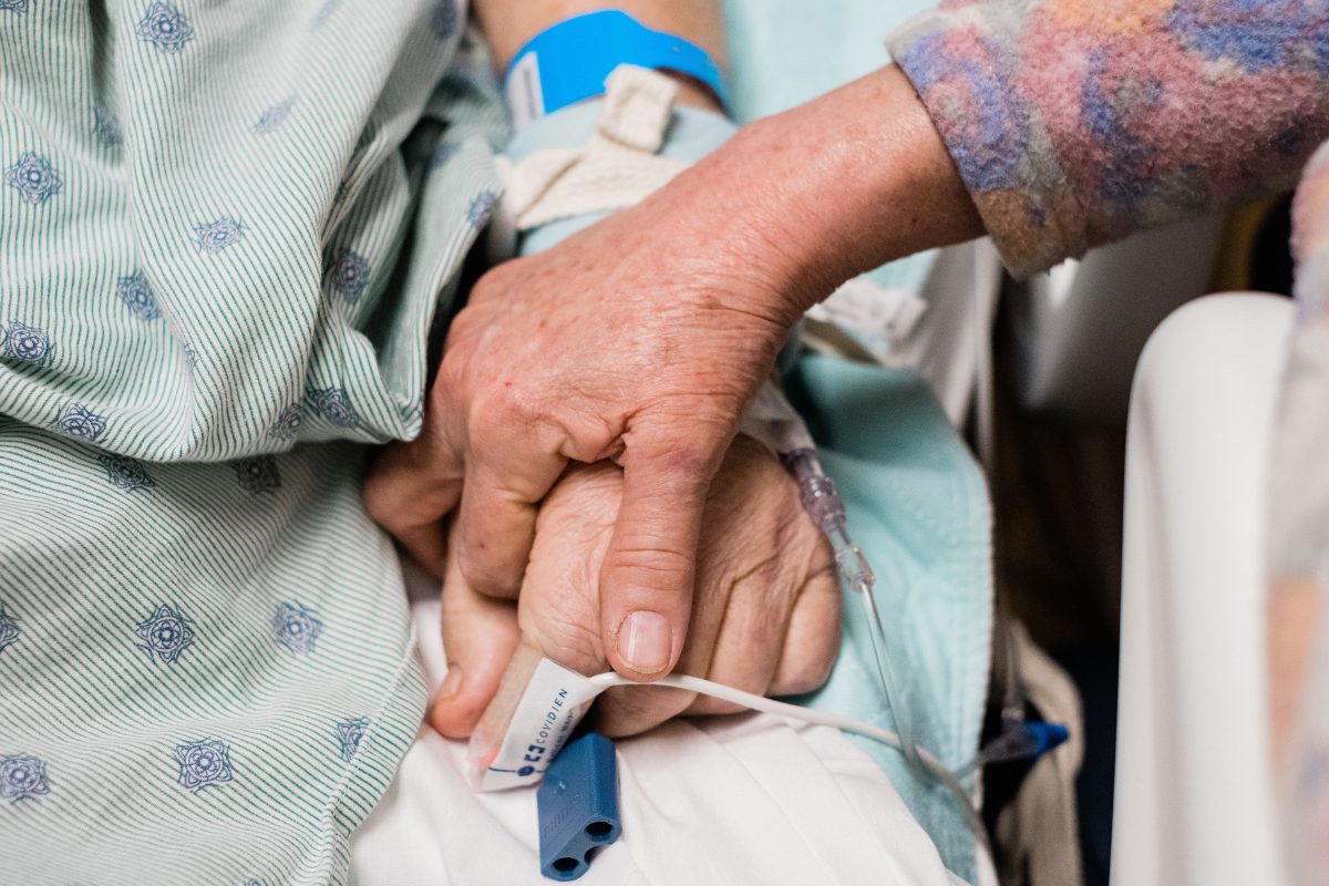 A woman comforts her husband of 55 years in the intensive care unit at Uniontown Hospital.