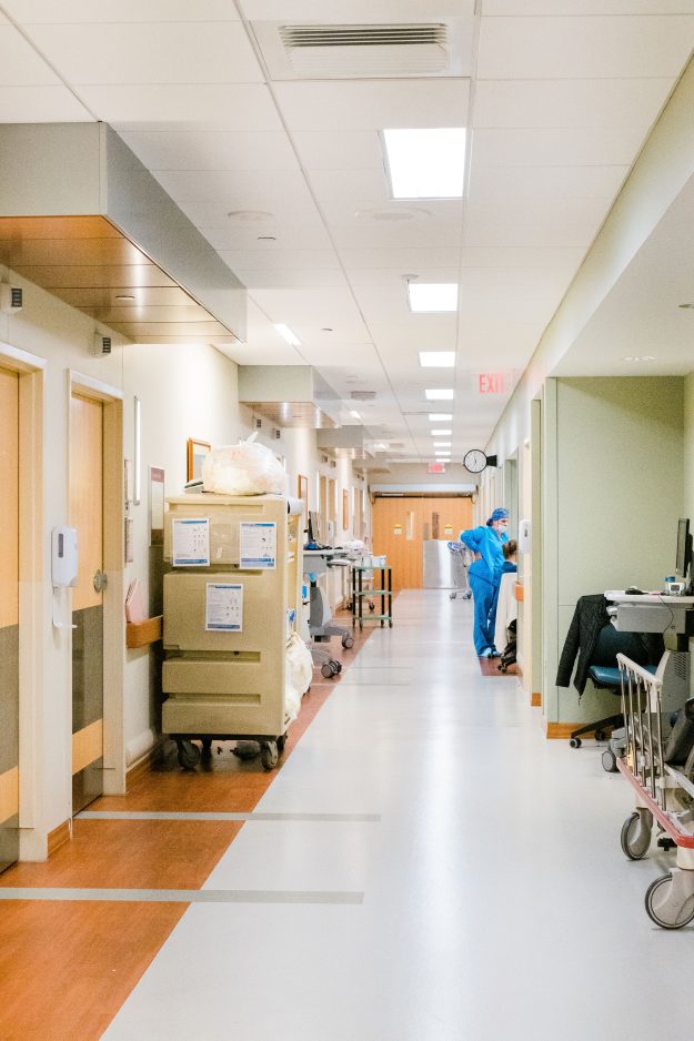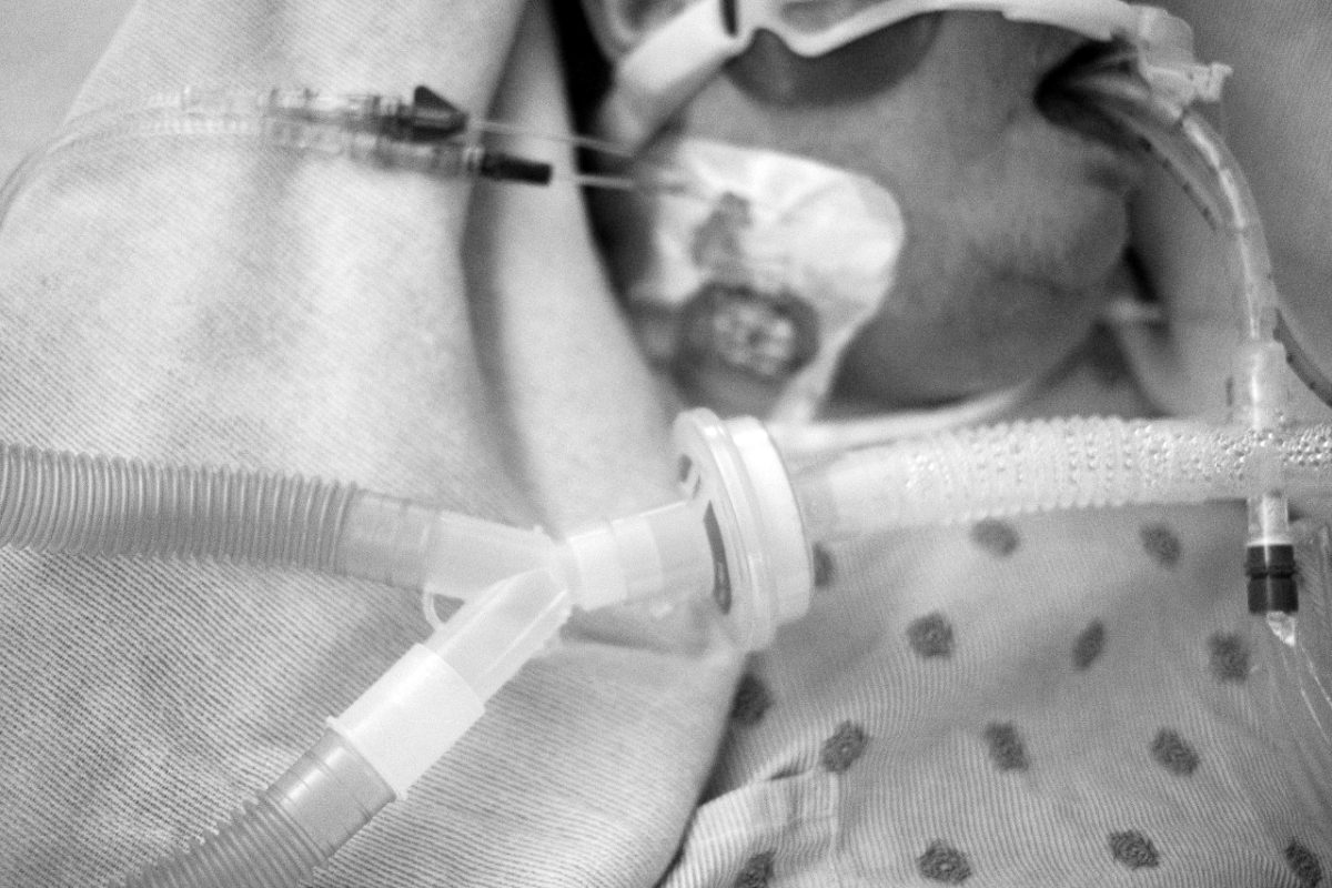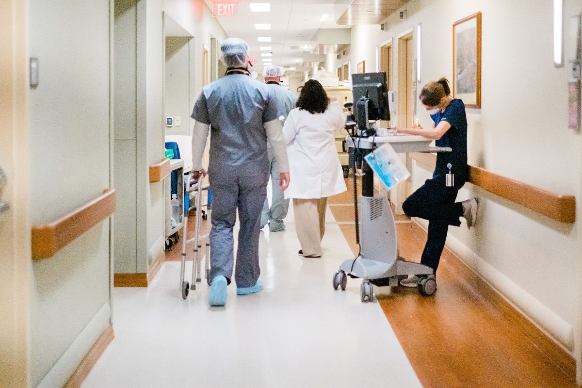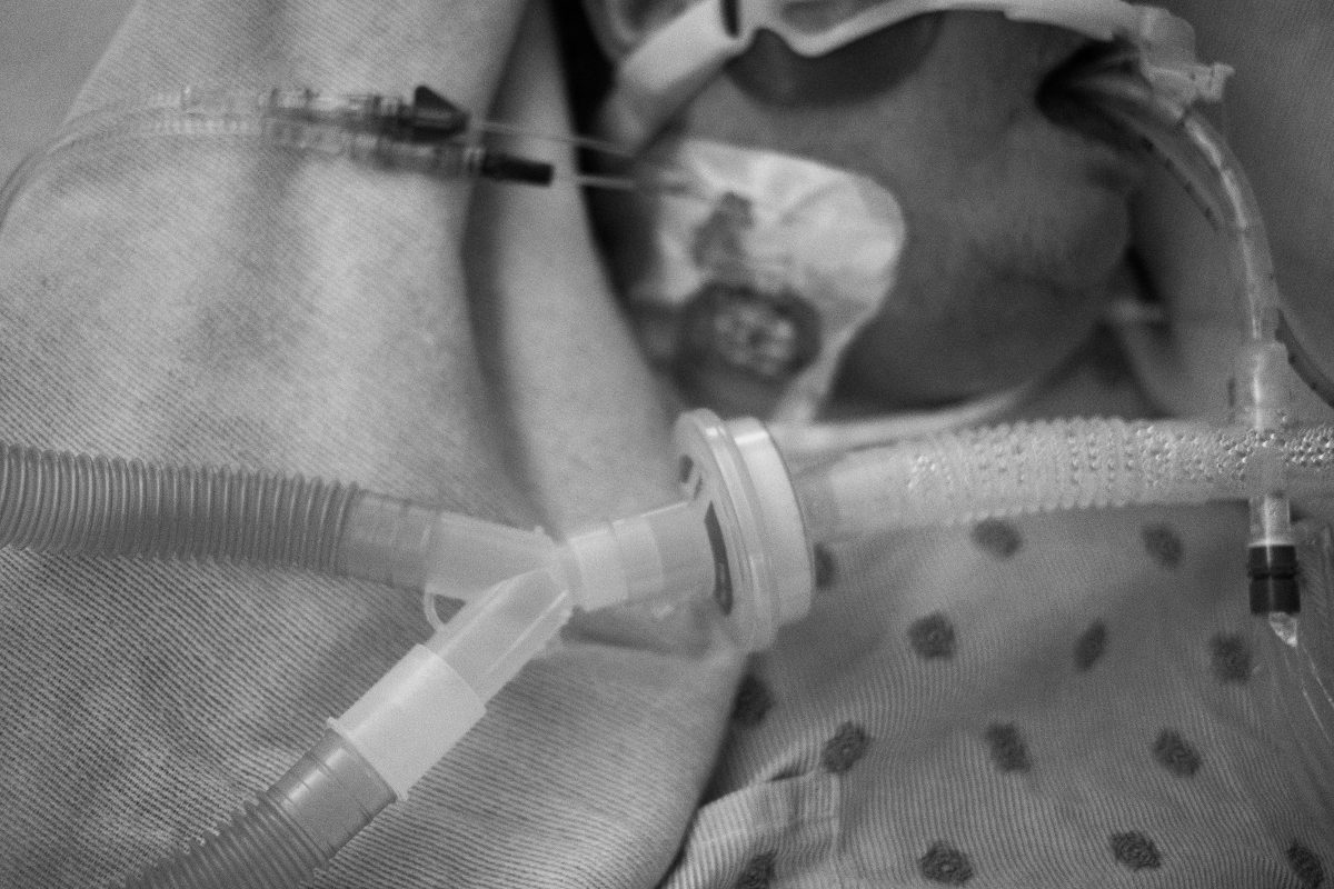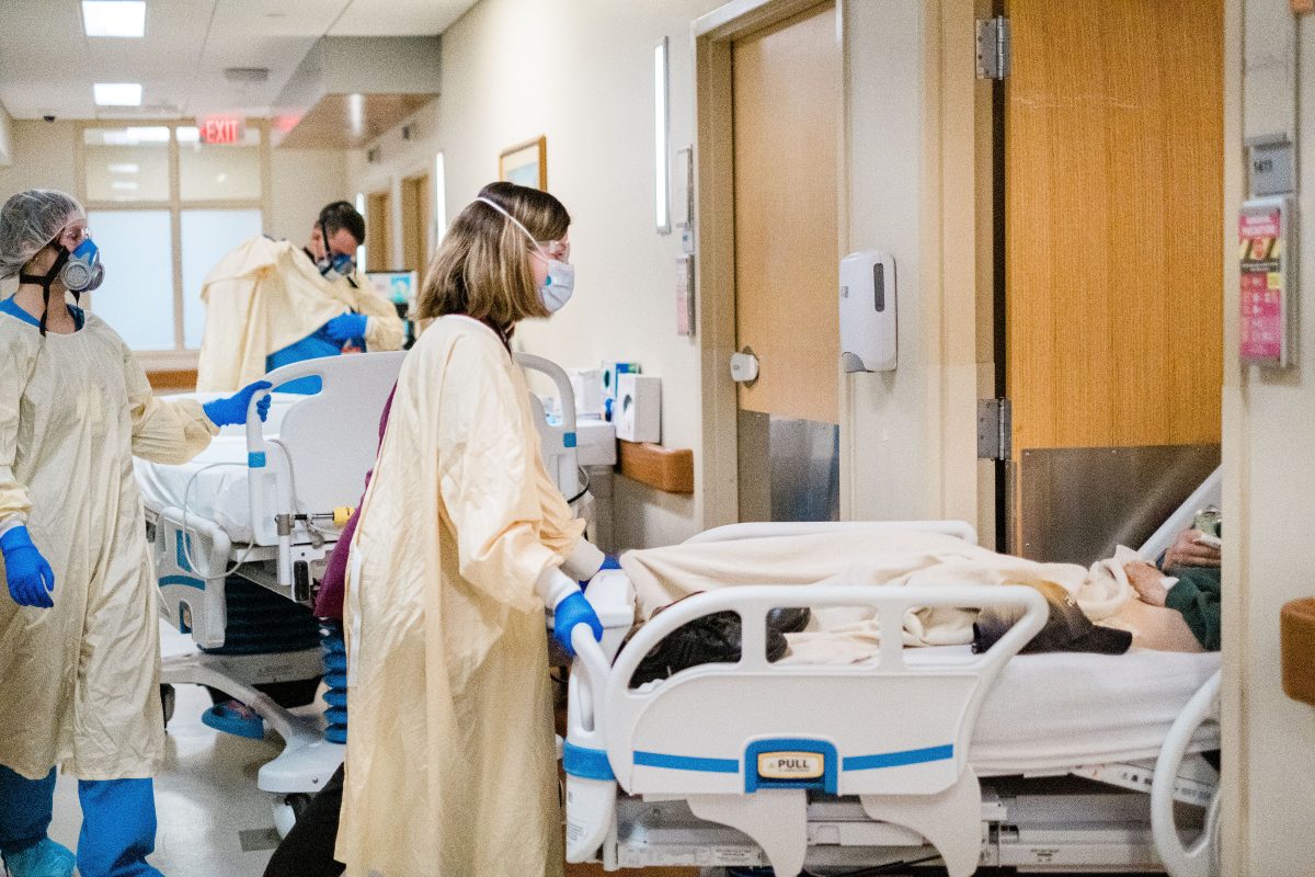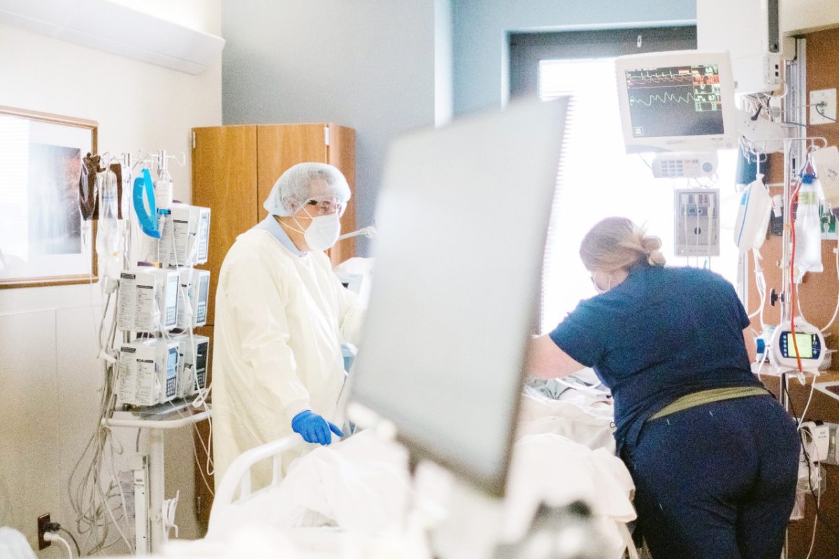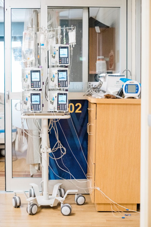 Upstairs, in the ICU, all 15 beds are occupied by COVID patients, all of whom are on ventilators. Multiple monitors keep track of vital organs, beeping and humming outside of the rooms’ big glass doors.
