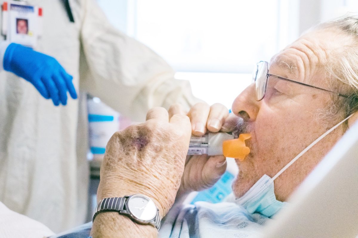Paul Lagojda inhales a breathing treatment on 1 West at Uniontown Hospital. During a follow-up appointment for a prostate issue, Lagojda tested positive and was admitted to the COVID wing.