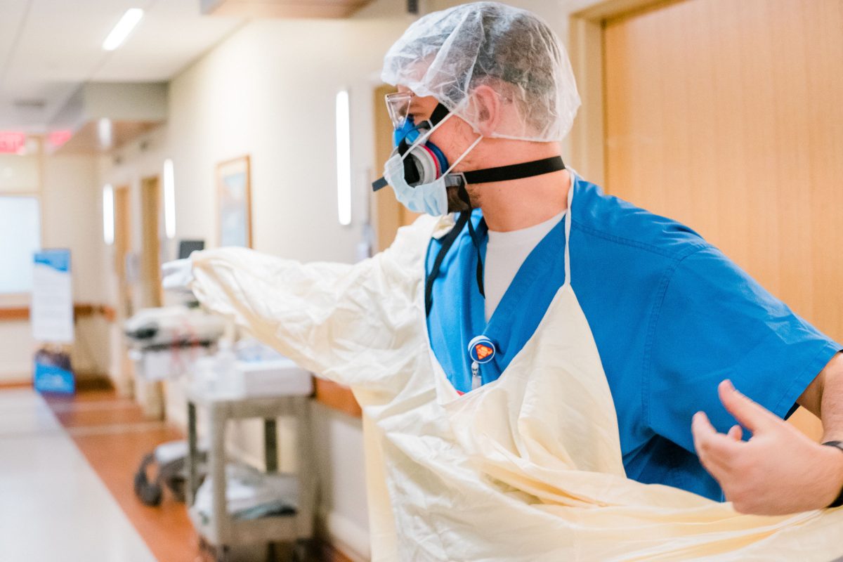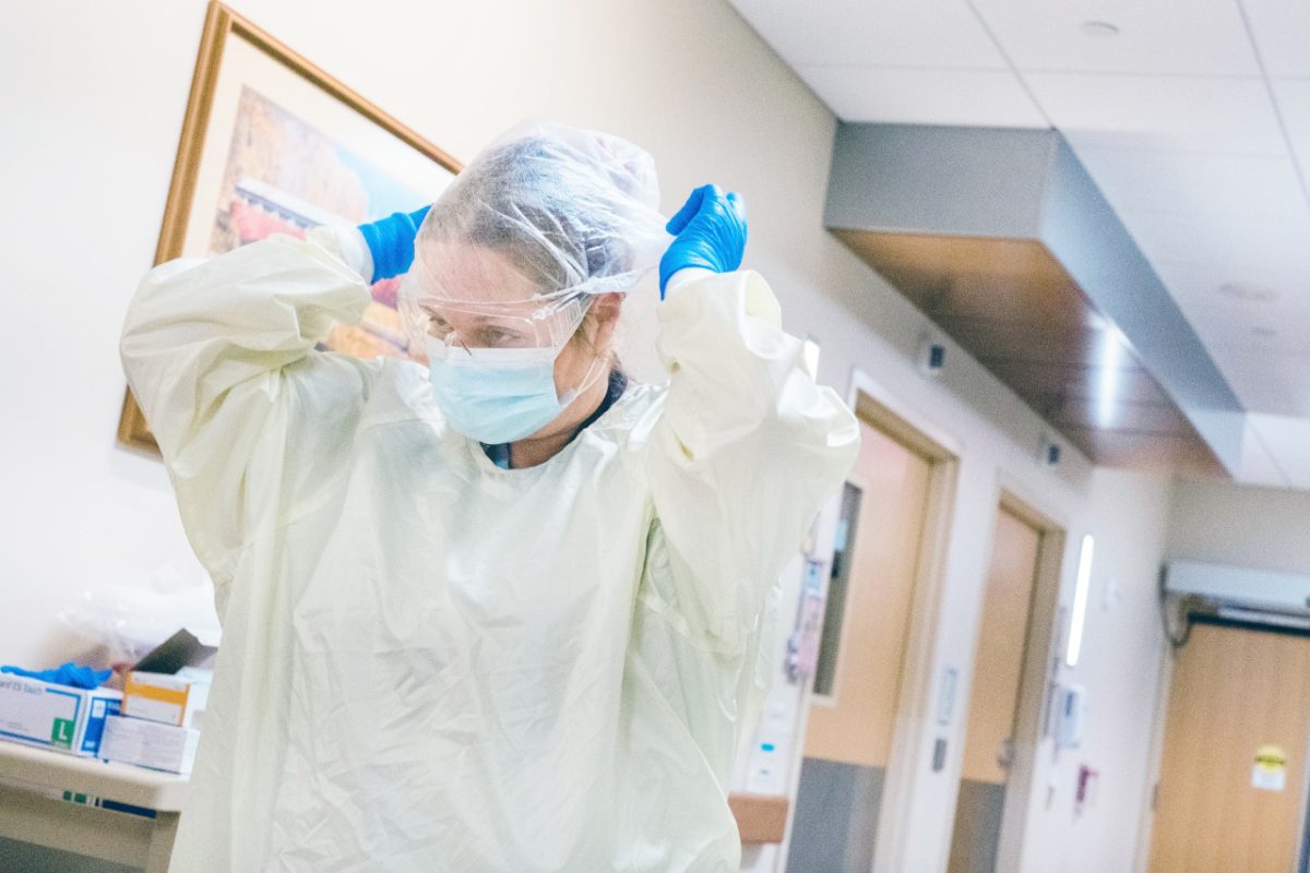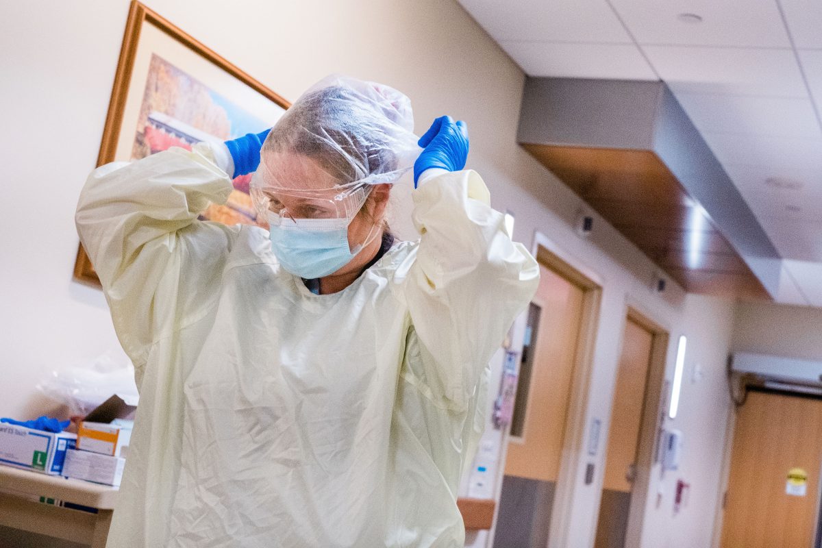 A health-care worker at Uniontown Hospital changes into personal protective equipment as she hurries down the long hallway of 1 West, the hospital’s COVID unit, to answer a patient’s call.