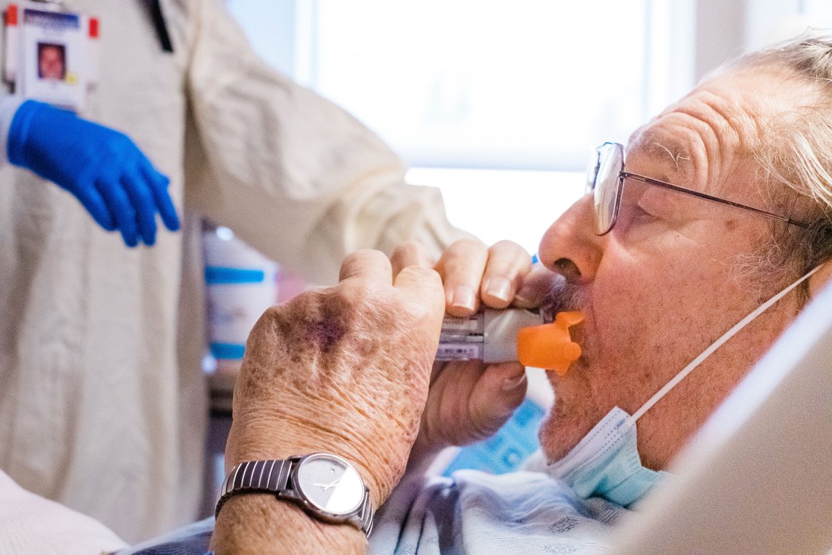 Paul Lagojda sits up in his hospital bed as his nurse, Alivia Rolaf, explains how to use the orange inhaler she unwrapped and placed in his hands.