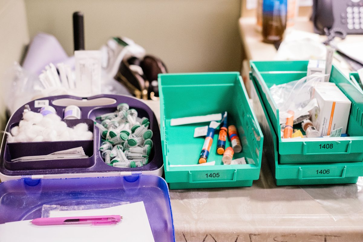 The nurse’s station along 1 West, Uniontown Hospital’s COVID wing, is stocked with medical essentials, including medications and cotton balls.