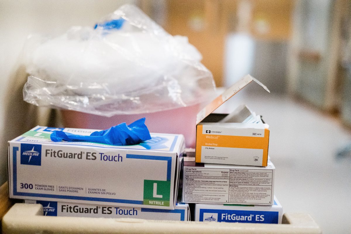 Stations along 1 West are stocked with PPE, including gloves, hair nets and robes that health-care workers must put on before entering a COVID patient’s room.
