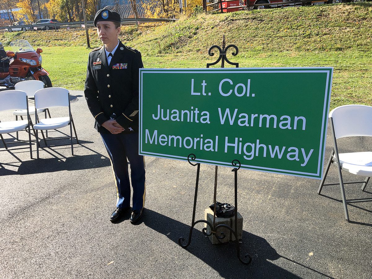 “It’s a sad but happy day,” Gen. George W. Casey Jr. said during a late-morning ceremony in which a section of Route 50 in Avella was named “Lt. Col. Juanita Warman Memorial Highway.” A crowd of more than 150 endured the chill outside Avella Volunteer Fire Department, including Warman’s mother, Eva Waddle, and other family members; veteran groups members; the three county commissioners; and all three Independence Township supervisors, including emcee Tom Jennings.