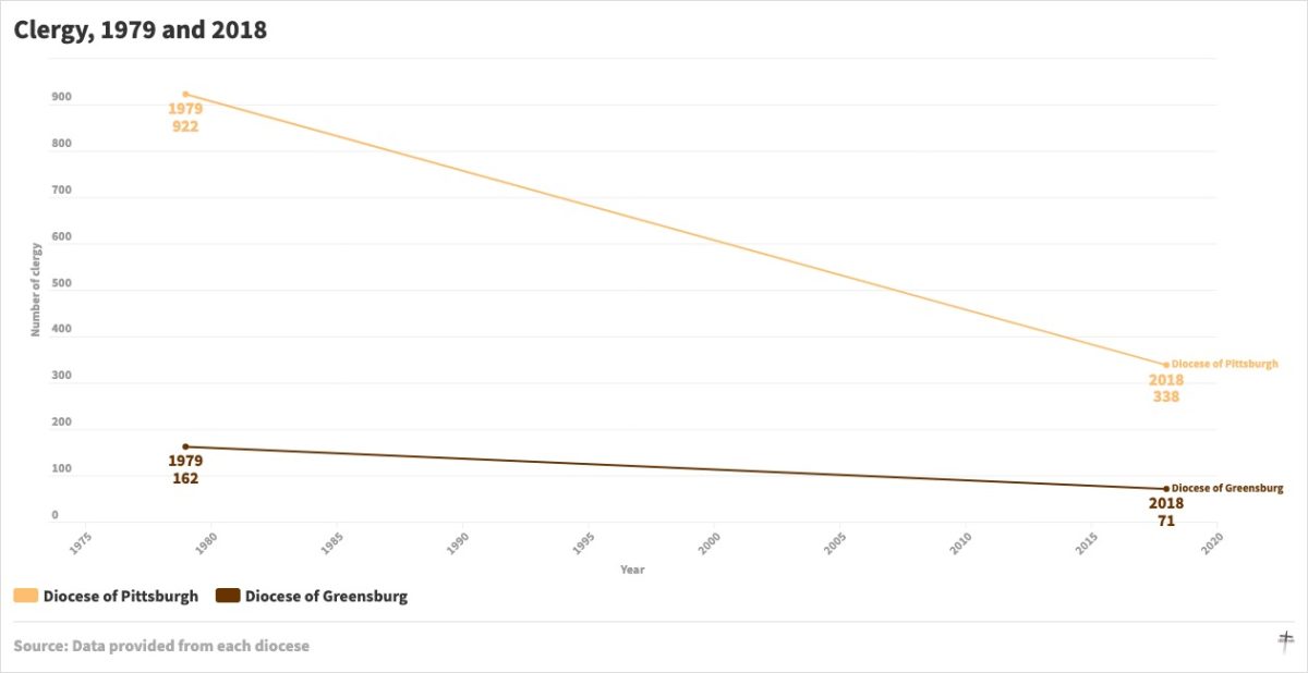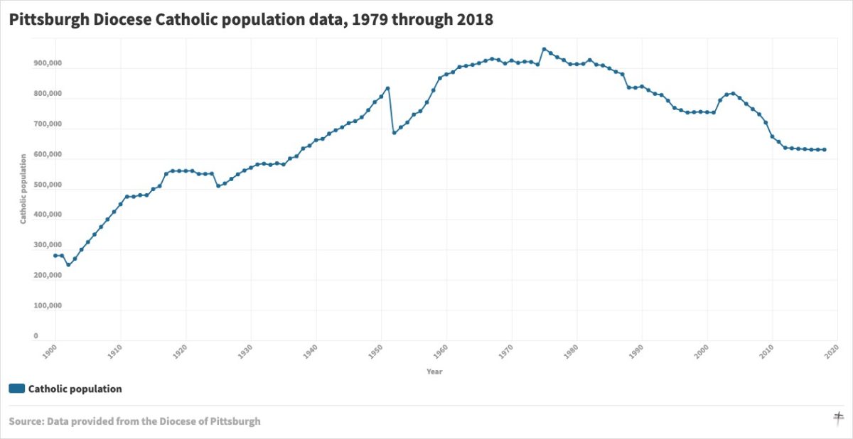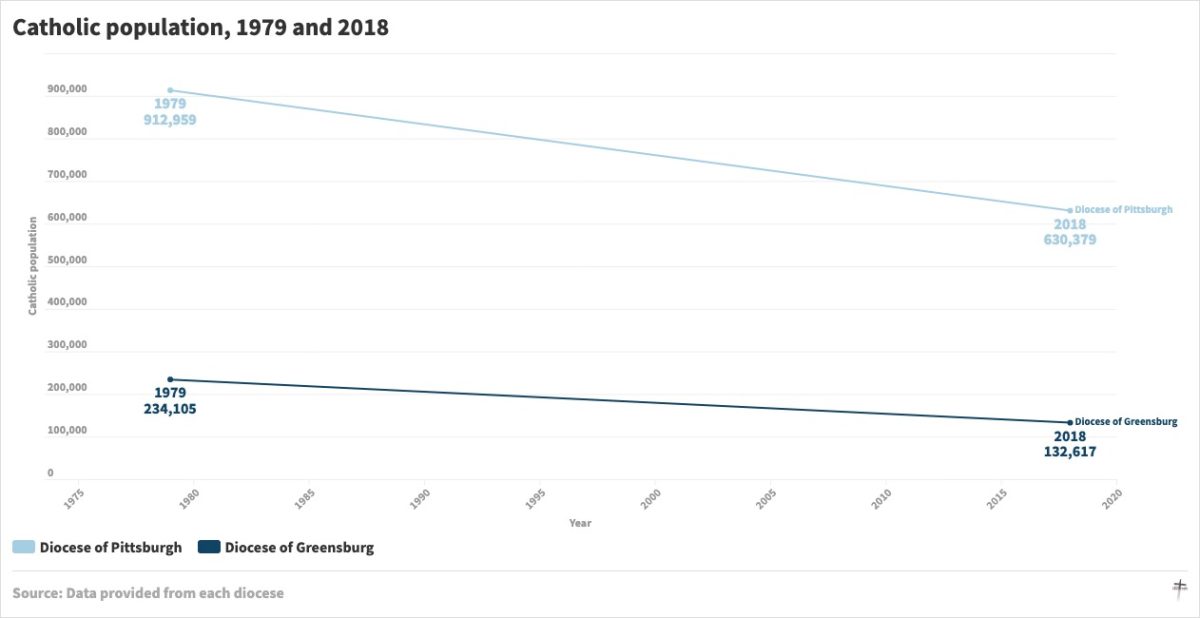 In 1979 the Pittsburgh Diocese had 912,959 Catholics. That same year, there were 234,105 in the Greensburg Diocese. By 2018, the number had dropped 30% to 630,379 in the Pittsburgh Diocese and 23% to 132,617 in the Greensburg Diocese.