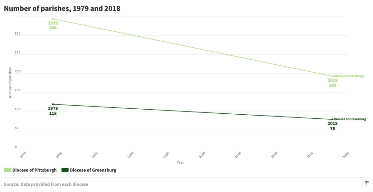 There are 39% fewer parishes in the Greensburg Diocese, where 118 parishes in 1979 were cut to 78 by 2018. The Pittsburgh Diocese was even harder hit, losing 44% of its parishes during the same time.