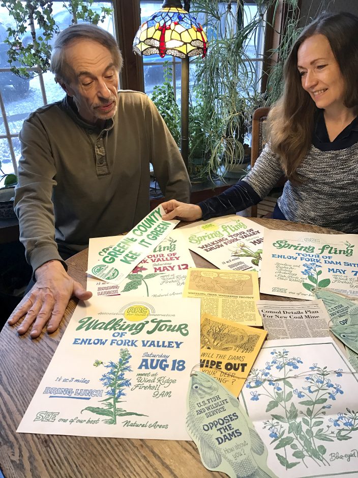 Members of ARC began attending meetings and public hearings, and soon ARC would have 300 people in its ranks, including Ed Perry of the U.S. Fish and Wildlife Service and Lawrence Strickling, a Chicago lawyer who married into the Crow family and learned about the potential loss of land when visiting for a family reunion. Arabelle Wheatly, a relative of the Dinsmore family and a professional illustrator who owned land near her family home in Richhill Township, became the one to add art to the effort, doing multicolor block prints of the flowers of Enlow to show the public the beauty of what was about to be lost.