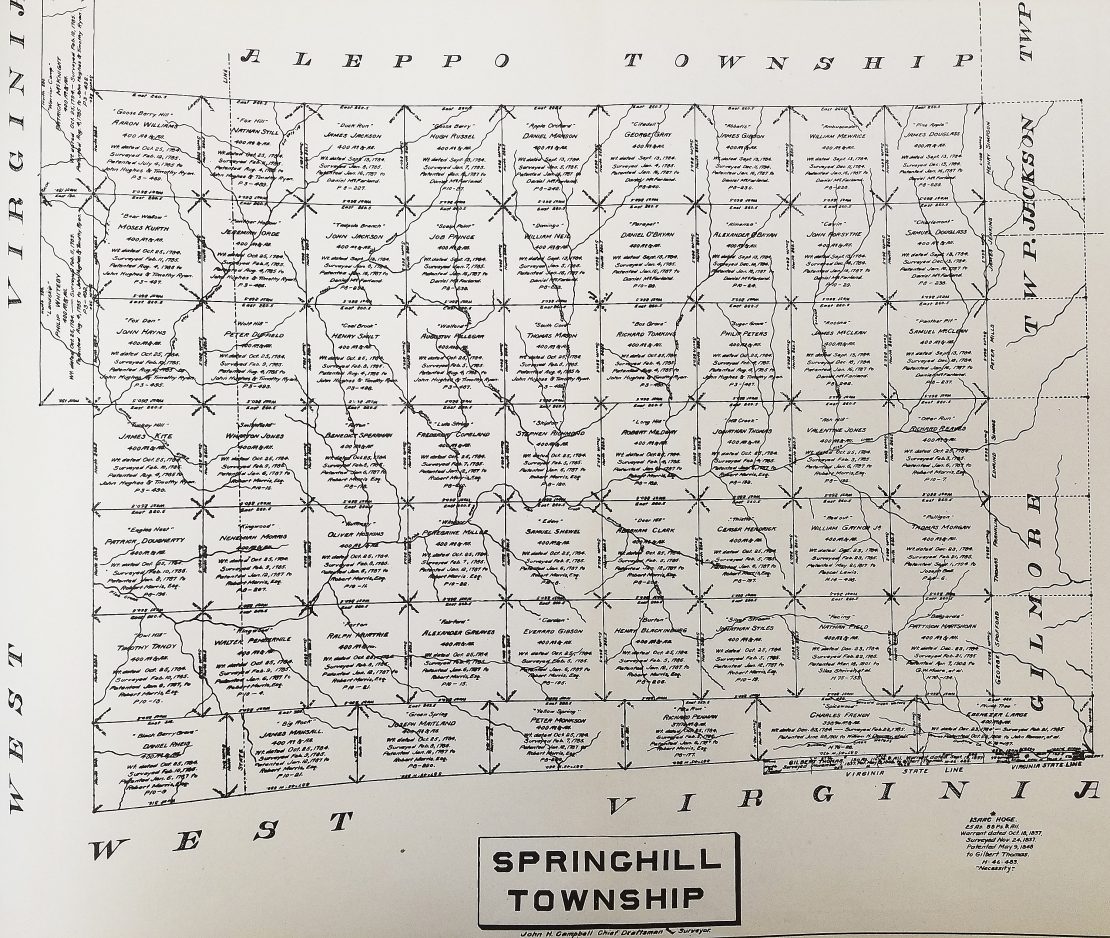 A 19th century map of Springhill Township shows the 27 parcels of land Robert Morris owned in the township. Morris purchased nearly 100 parcels present-day Greene County in January 1787.