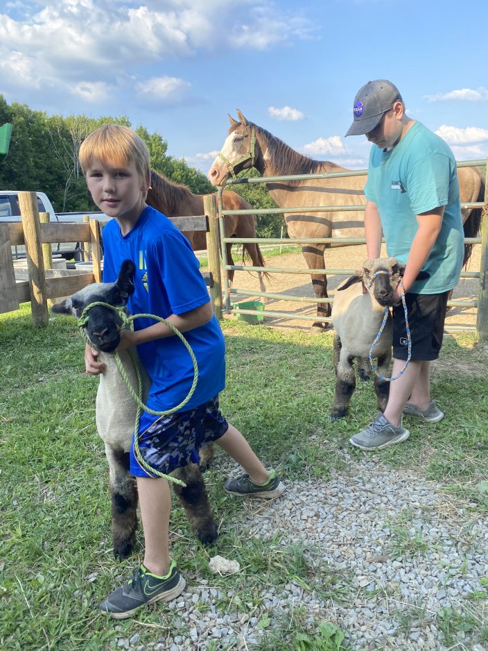 First-year 4-Her John Myers Bowman, now 10, went to the Greene County Fair last year, watched his neighbor Chase show his lamb and decided he wanted to do it too. I’m introduced to Chester and Poplar, shorn, frisky and almost ready for the ring. John and Chase square them up and give me a preview of how they will stand for the judges on August 12.