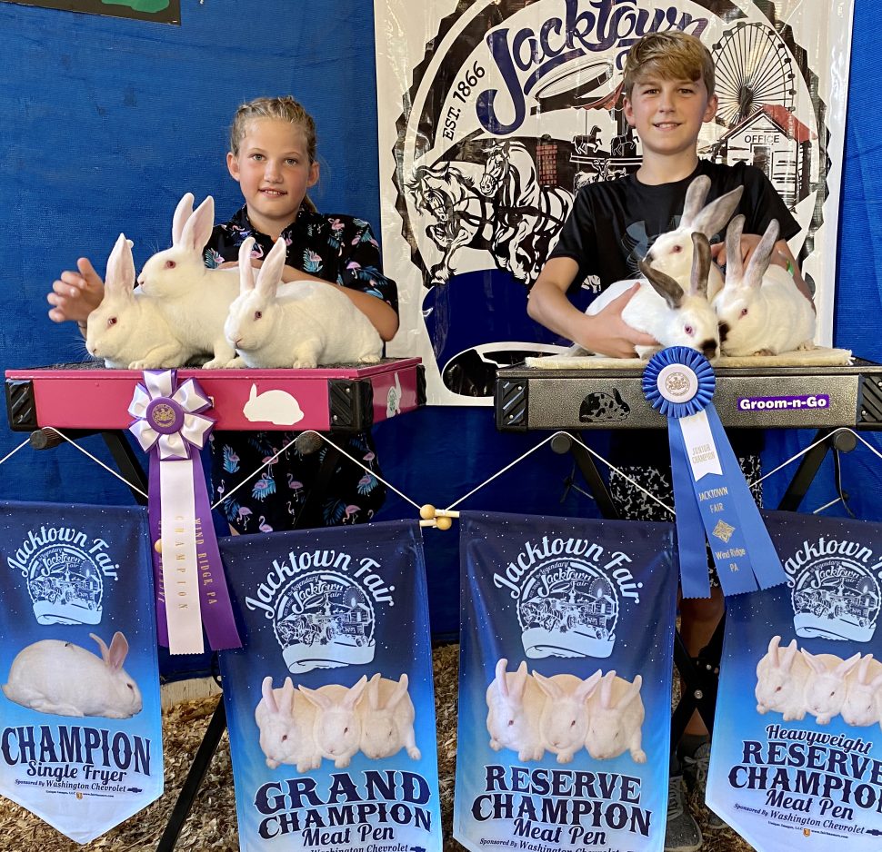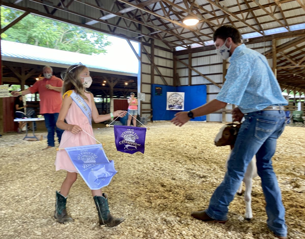 Jacktown Fair kept its bragging rights as arguably the longest continually running fair in the United States by hosting the 4-H market rabbit and market goat show and sale on July 17, poster and baking contests and vacation bible school the next day and outdoor services and a catered church social with music by Heart and Soul for the community on Sunday. The high-ceilinged arena gave plenty of elbow room to masked-up kids showing rabbits in the morning and goats of many colors judged by Todd Minor of Fayette County in the afternoon. I got there as blue-jeaned contenders hit the ring, squared up their goats for Todd, and listened as he described each entry’s attributes and, if chosen, trotted to the middle of the ring for ribbons and rounds of applause from proud families. Senior Tristan Cole of Waynesburg ended his 4-H career with a bang when he accepted the Grand Champion Market Goat banner handed to him by Jacktown Fair princess Madison Burns.
