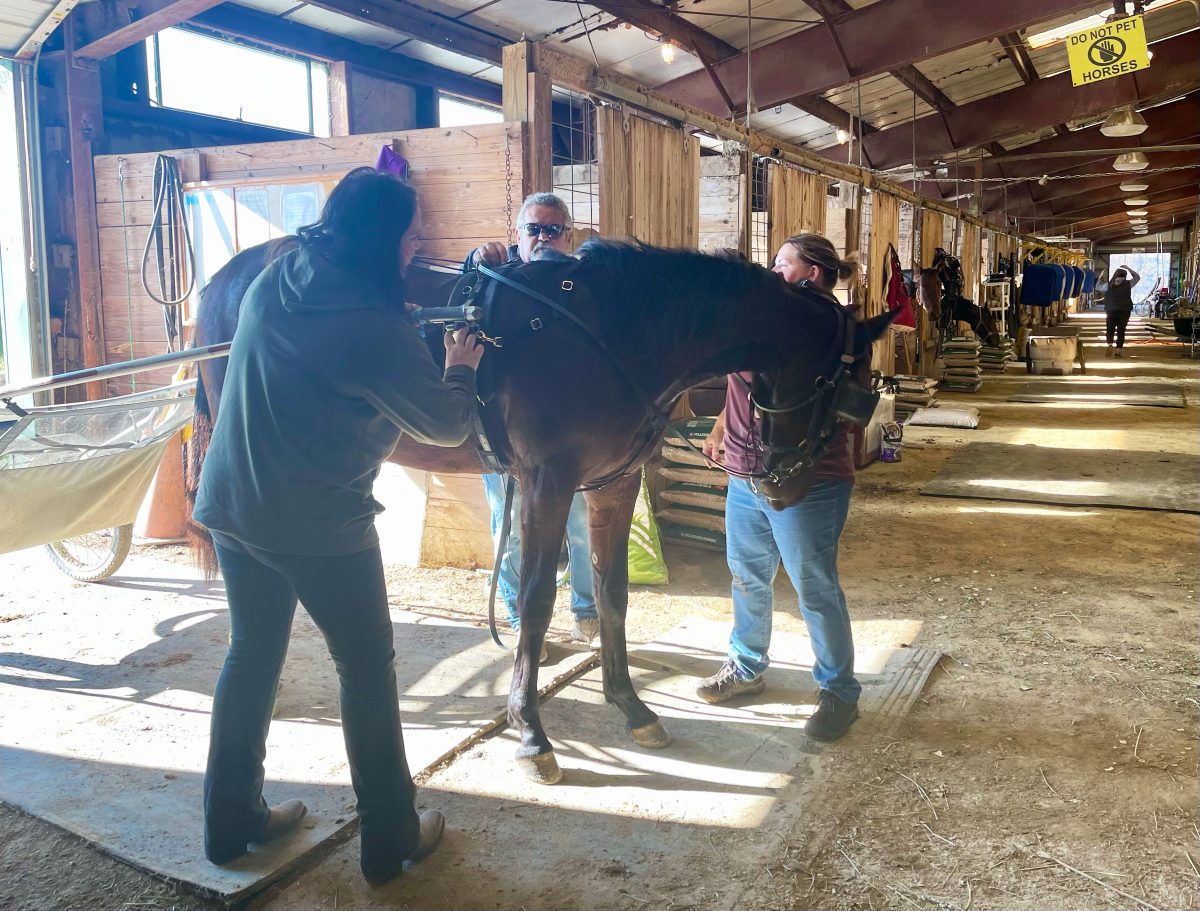 I first met Jessica Johnson on a much warmer afternoon a few weeks earlier when Nick Roland Stable arrived from Iowa to set up for a winter of training and competing at the Meadows. She and Nick Roland had just gotten in at 4 a.m. bringing fifteen horses with more on the way, filling most of the available stalls on the track facing side of the barn.