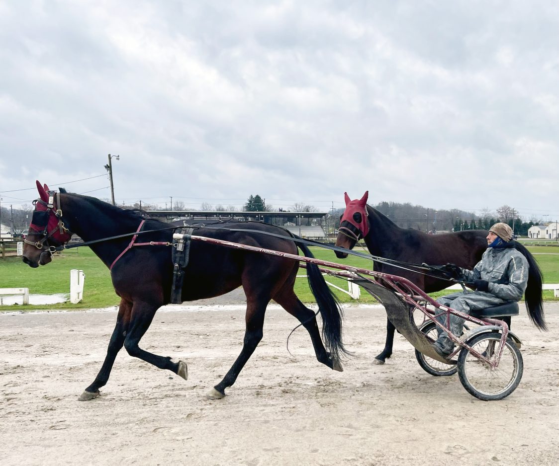 The drizzle leaves snowflake shadows on the windshield as I turn from Jefferson Road, aka Rt. 188, onto the swoop of macadam that leads up to the 4-H barn at the edge of the Greene County Fairgrounds. A few minutes past 8 a.m., trainer Jerry Lee is already loading up for the Meadows, aka Meadowlands Racetrack and Casino in Washington. A dozen races are on for today, and he’ll be running in the first, groom Jody Corwin says. I’m here, hot coffee in hand, ready to become part of a day in the life of the people and horses that live and breathe harness racing. It’s a day that begins early and ends late – just like every other day at the races – rain, snow or shine. The stable’s gray tabby, known as Renee’s Cat, says hello. She knows I have treats in my pocket. I grab a plastic chair from Jerry’s corner and move it to the middle of the barn beside an already muddy jog cart. Steam is rising from the sleek, muscled body of a horse fresh from the track. The first act has already begun. These countless moments flow seamlessly into hours as workers, trainers and owners arrive to feed and water, clean stalls, attend to legs and hooves, then harness up and head out to the half-mile track for a three-something-mile workout. Then back to the barn for a good lather up and hose down, then into the stall as other horses get harnessed and hitched. These animals are seasoned athletes that race from the time they are two-year-olds through perhaps another dozen years before retiring to pasture to breed or get retrained to be some trail rider’s new best friend. When the half-mile track at the fairgrounds was built in 1911, harness racing was already the big-ticket draw at fairgrounds across rural America, and the finish line was where the crowds cheered as their favorite bets crossed it. The first pacers and trotters that competed here in 1912 during the July 4 races drew 2,500 spectators and $6,000 in purses alone, never mind the side bets. I first met Jessica Johnson on a much warmer afternoon a few weeks earlier when Nick Roland Stable arrived from Iowa to set up for a winter of training and competing at the Meadows. She and Nick Roland had just gotten in at 4 a.m. bringing fifteen horses with more on the way, filling most of the available stalls on the track facing side of the barn. “We needed a place to pony our horses that don’t need to harness up every day and also lead them with the truck, which is a nice leisurely way to get exercise. We called stables all around the Meadows, and Greene County had what we need, so here we are. This is a great location for us.” Nick Roland is a “fourth generation horseman, his mom and dad both raced,” Johnson tells me. He took his written exam, got his licenses to train and drive at age 16 and “put himself through college on his summer winnings.” By 2008, Roland could finally quit selling insurance and race full-time. They met at a racetrack in Minnesota where Johnson was training riding horses. Two years after she started working for him, “we started dating.” That was 11 years ago. “Now we’re partners. I’m covered in dirt every day and couldn’t be happier!” Jerry Lee’s horses are stabled at one end of the shed row with stalls on both sides of the center aisle. At the far end is the row of blue bags filled with racing gear that mark the stalls local trainer Rob “Buddy” Berdine is occupying. In the middle are the newly arrived standardbreds of Nick Roland Stable, 19 horses in all. Daylight spills in from the big middle doorway where horses and jog carts arrive and depart. Johnson marks the dry-erase training board with each horse’s particulars – who worked what day, feed allotment, workout speed and shoeing schedules. On the other side of the barn are fellow renters – 4-H kids, private owners and barrel racers looking for room to practice their moves in the indoor arena beyond the track, stretch legs in the outdoor ring in the big field and mosey the trails and roadways that crisscross the fairground’s 40 acres. The 110-stall 4-H barn was built in 1975 to replace a 50-stall barn that was outgrown and outdated. The new barn offered hot and cold running water for filling buckets and those lather-ups between workouts and had plenty of room for camaraderie. Some 4-Hers who got their start here would grow up to become prize-winning barrel racers and harness horse drivers or return to board their own horses and work for the trainers who keep their stables here. Case in point – Harness racing legend Dave Palone. When 50-year-old Palone broke the harness racing world record in 2012 with his 15,181st win, he was driving Herculotte Hanover, “a two-year-old filly that had never competed in a pari-mutuel race before.” Joe Tuscano wrote all about it that year in the Greene County Living magazine special edition: “Greene County natives who hit the big time.” Ten years later, Palone is still training and racing at the Meadows. I learned this when I mentioned his name at the barn and learned that everybody knew Dave. So I messaged my friend and his cousin Lucille Palone DeFrank, who connected me with his mom. I was eager to hear the backstory about how Palone got his start here at the 4-H barn. “He said he was going to drive horses when he was 10 years old. He was born to do this, I guess,” Jeannie Palone told me when I called. The family lived in Rices Landing and got into riding horses as the kids got older. Jeannie took up trail riding too. “You know Dr. Marx, the vet? He gave us the best advice; he said horses are dangerous animals, get someone to teach you to ride. So we did. Dave learned a lot in 4-H – he showed English saddle seat because he said it was more challenging. I think that’s what got him into harness racing, using those reins. His senior year, he went to school in the morning and trained in the afternoon at the fairgrounds with Herman Hylkema, one of the best trainers at the Meadows. That