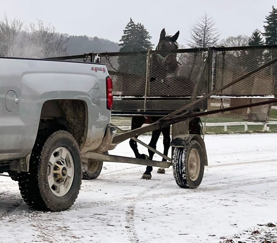 Two mornings later, I’m back for one last shot for the story – Jerry Lee’s grooms taking Ruffled Up on a leisurely lead behind the truck. The temperature is still dropping, snow on the ground, and it’s something after 9 a.m. last time I looked. But never mind that. Jerry Lee is already on the road with his trailer and won’t be back until dark. Come rain, snow or shine, win or lose, he and his buddy Dave Palone will be racing at the Meadows today.