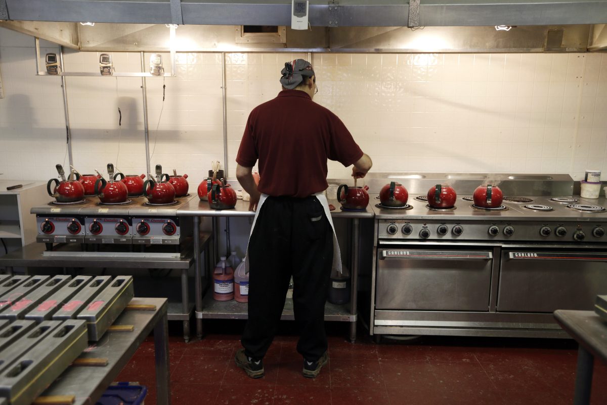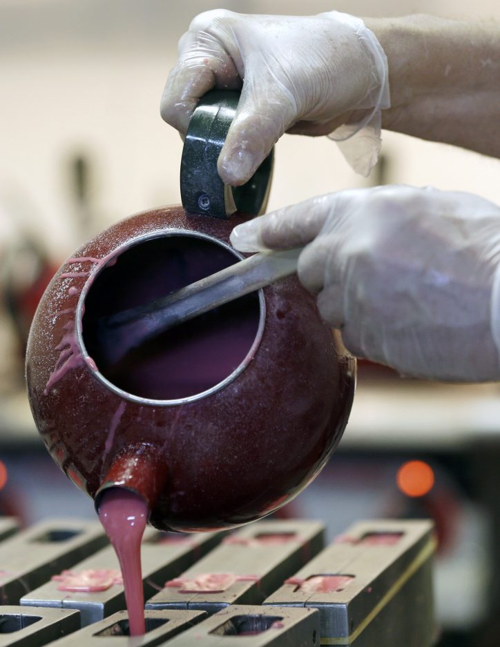 As Fitzgerald spoke, workers stirred bubbling tea pots filled with a Pepto-pink mix of sugar and corn syrup. The candy mix is hand-poured into cast aluminum molds to make one of three pigs: Holly (3 ounces and 3 1/2-inches long), Noel (a half pound and 5 1/2 inches) or the big man, Clarence (1 pound and 6 inches).