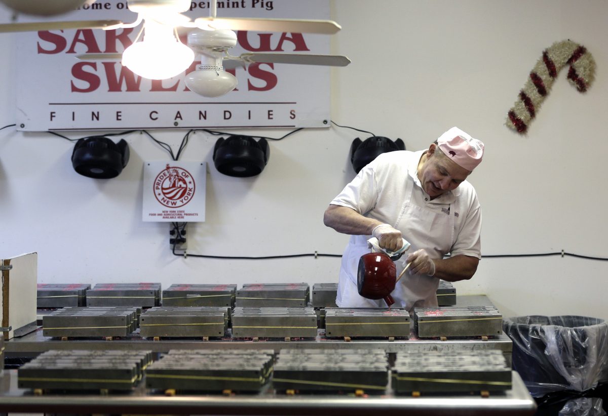 Fitzgerald has pigs on his brain this time of year. A small crew at his shop south of Saratoga Springs in Halfmoon makes the hard candy from dawn to dark in a shop distinguished by boiling red pots of candy and an overwhelming scent of peppermint. Fitzgerald is hurrying to fill thousands of pig orders around the country.