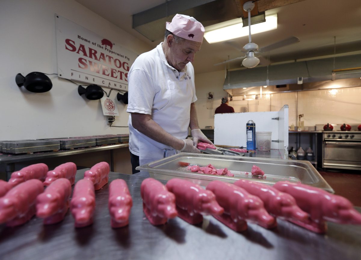 SARATOGA SPRINGS, N.Y. – A holiday tradition in this upstate New York resort town has a peppermint twist: pig-shaped hard candies are sold with little metal hammers to smash them at Christmas.