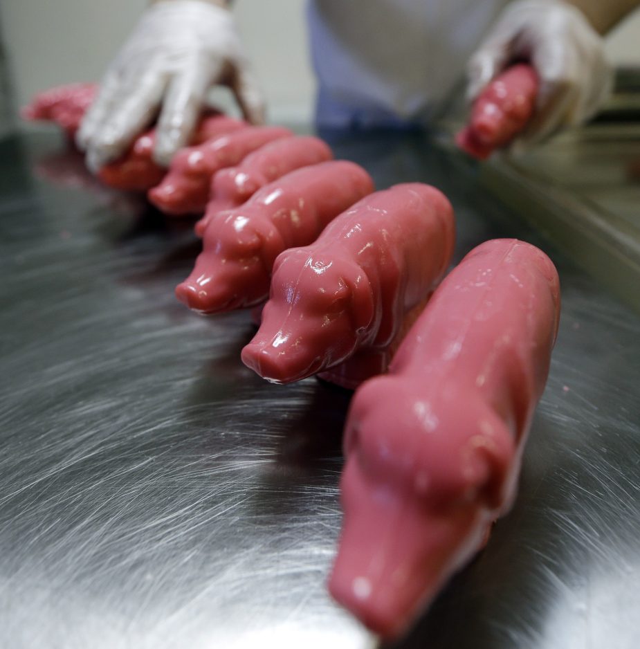 “We do find that some people are a little taken aback: ‘What’s the whole idea of the pig and the hammer? What are you doing? And is someone insulting me by giving me a pig?”‘ said Mike Fitzgerald, owner of Saratoga Sweets, which makes the pigs that can be the size of a big bar of bath soap.
