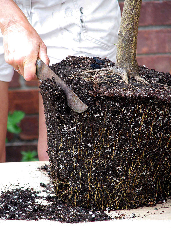 To root prune, take a sharp knife, grit your teeth, and slice a one-half to 2-inch layer of soil from all around and underneath the root ball. The larger the root ball, the more soil and roots can be removed.