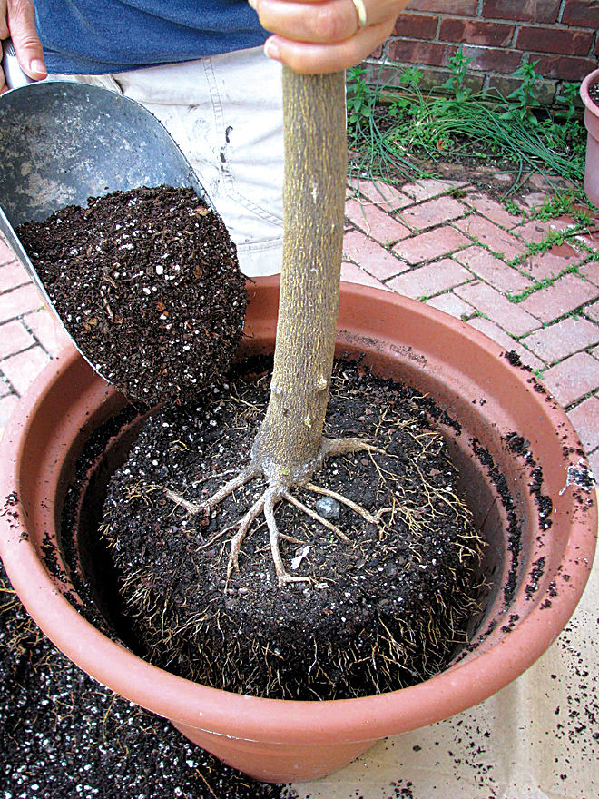 With roots pruned, the plant is ready to return to its pot. Put a stone or screen over any drainage holes, then shovel in enough soil so that the base of the plant’s stem sits one-half to 1 inch below the rim. Gradually fill the space between the root ball and the pot with potting soil, tamping it in place with your finger tips or a blunt stick.