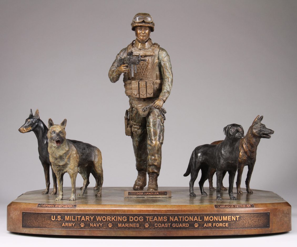 Burnam designed the monument, which depicts the modern military handler and four dogs: a Doberman, German shepherd, Labrador retriever and Belgian Malinois, all breeds used in wars.