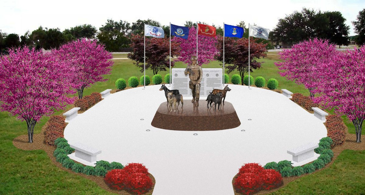 The figures will stand on a pedestal, in front of a large granite wall. One side of the wall will have photos etched in black marble veneer showing dog teams in combat from the different wars. The other side will have an inscription written by Burnam.